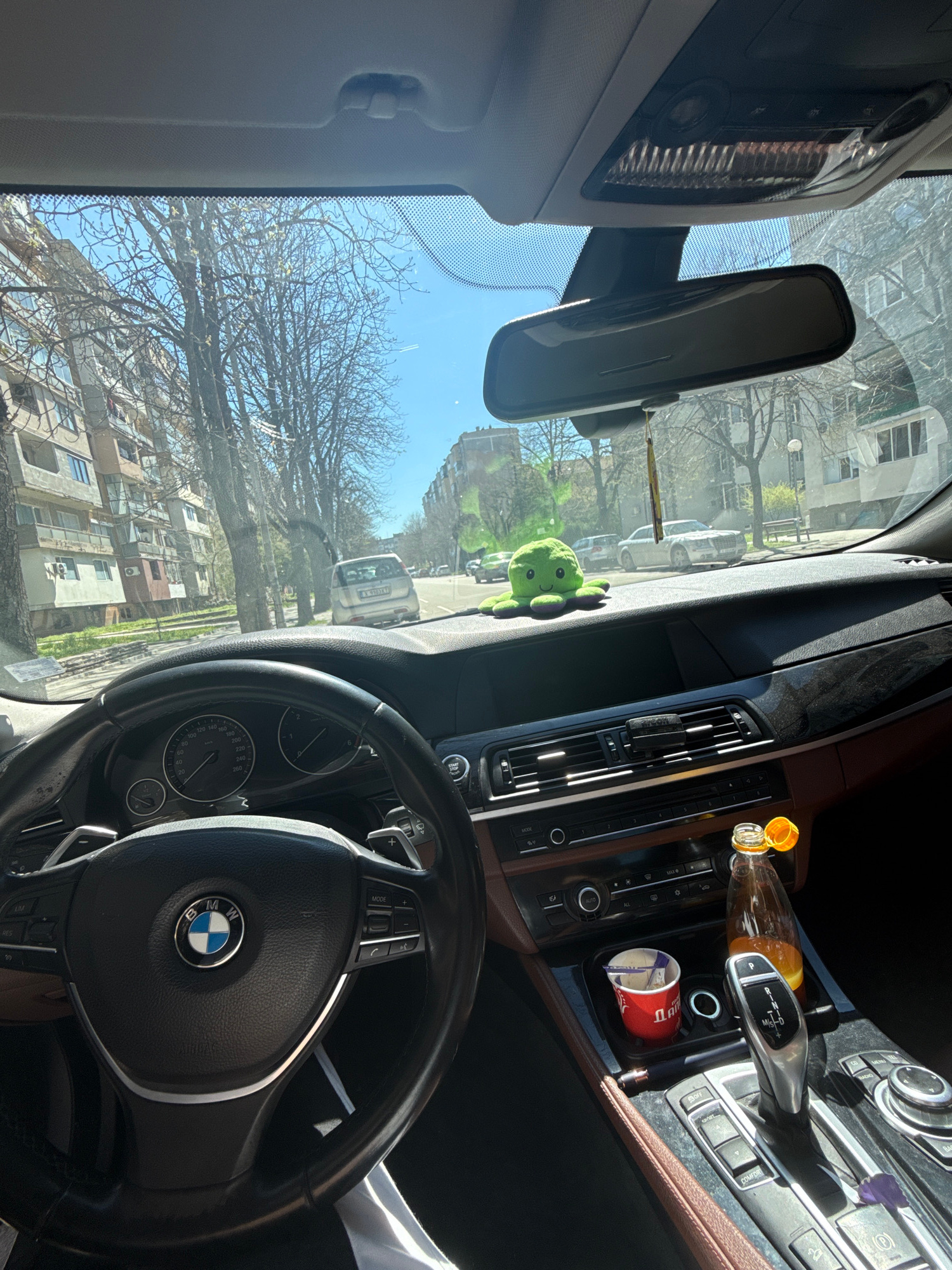 The image depicts the interior of a BMW car, likely parked on a street in Dimitrovgrad, Bulgaria. The steering wheel, dashboard, and center console are visible. A stuffed green octopus toy is on the dā¦read more