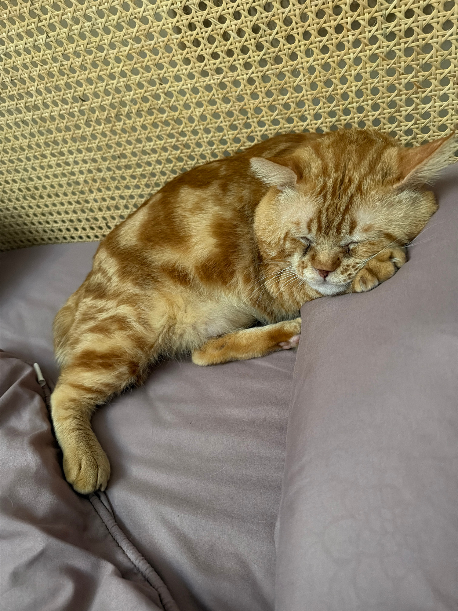 A medium shot depicts an orange tabby cat curled up asleep on a cushion. The cat's head rests on the cushion's edge, with its paw tucked near its face. The cat's body is sprawled out, with its tail an…read more