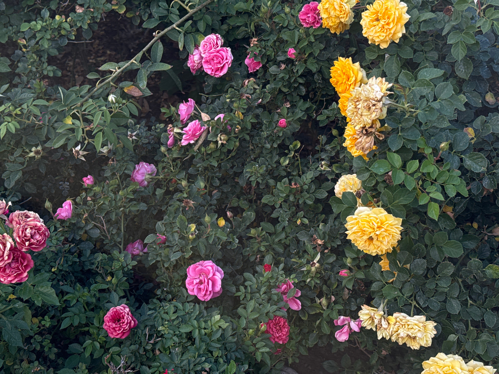 The image shows a dense collection of rose bushes in a garden setting. The roses are a mix of pink and yellow varieties, some in full bloom, others faded or withering. The bushes are surrounded by gre…read more