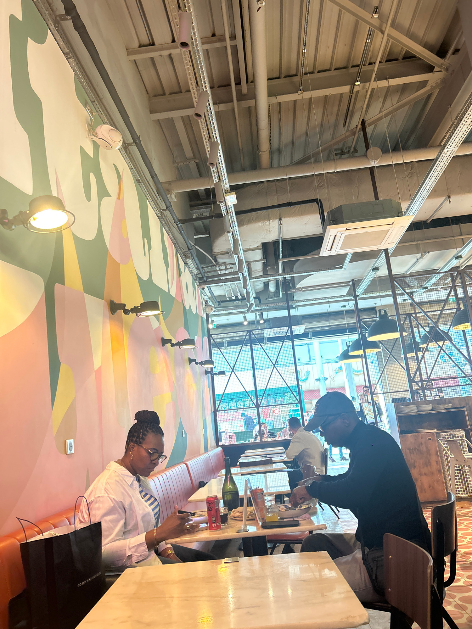The image captures an indoor scene in Serris, France, featuring a high-ceilinged space with visible industrial infrastructure such as metal conduits, support beams, and ventilation systems. The lower half of the wall is adorned with a vibrant mural composed of geometric shapes and pastel colors. Recessed spotlights are positioned along the wall, and a single, more prominent spotlight is located in the foreground. In the foreground, a woman wearing glasses and a white striped shirt sits at a table. She is holding a mobile phone in her right hand and appears to be interacting with it. On the table, there are bottles, glasses, and various items suggesting a meal or gathering. Another individual is partially visible in the background, dressed in black and leaning over the table, seemingly involved in the activities taking place there. The background reveals an open area with additional tables and seating, indicating a restaurant or café setting. The architectural design suggests a blend of industrial and modern elements. | Open Wire