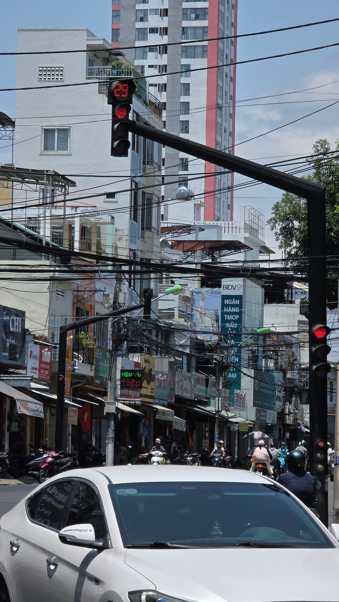 The image shows a street scene in Nha Trang, Vietnam, characterized by a dense urban environment with numerous buildings, overhead power lines, and traffic. A white car is prominently positioned on th…read more