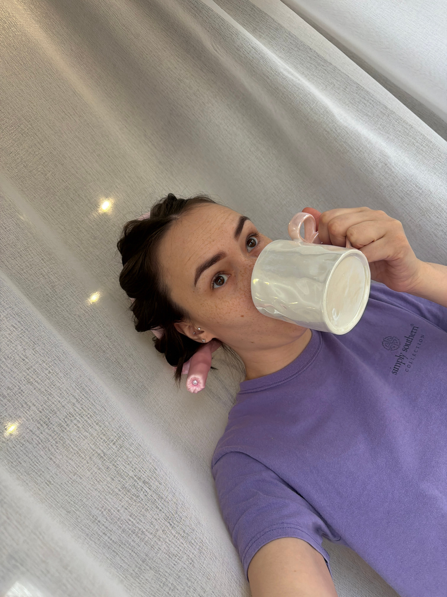 The image depicts a person, upside down, holding a white iridescent mug with a pink handle up to their face. The person is wearing a purple shirt with a "Simply Southern Collection" logo on the upper…read more