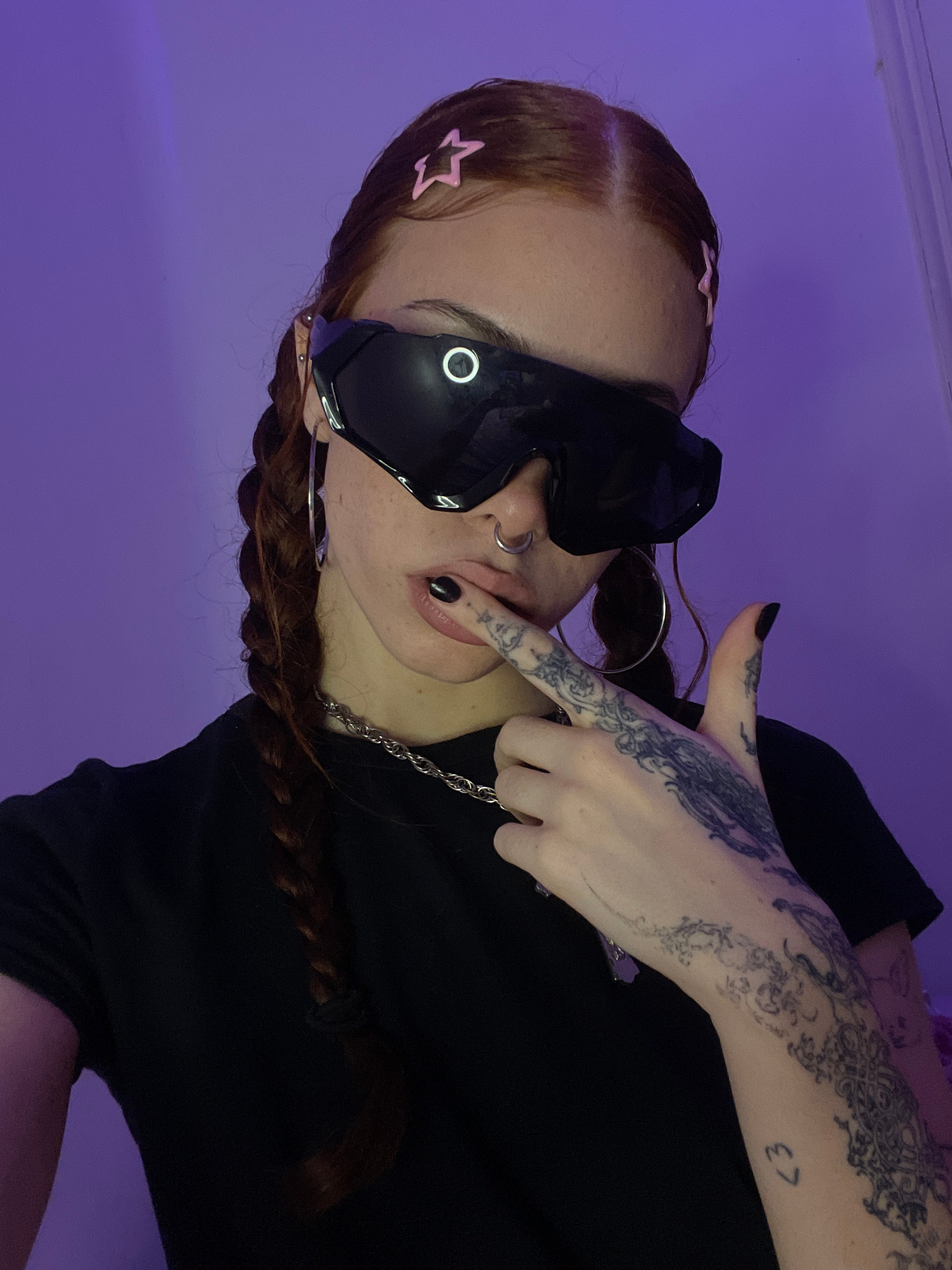 A person with red hair styled in braids and adorned with star-shaped hair clips poses in a photo. They are wearing large black sunglasses with a ring light reflection visible in the lens. A nose ring…read more