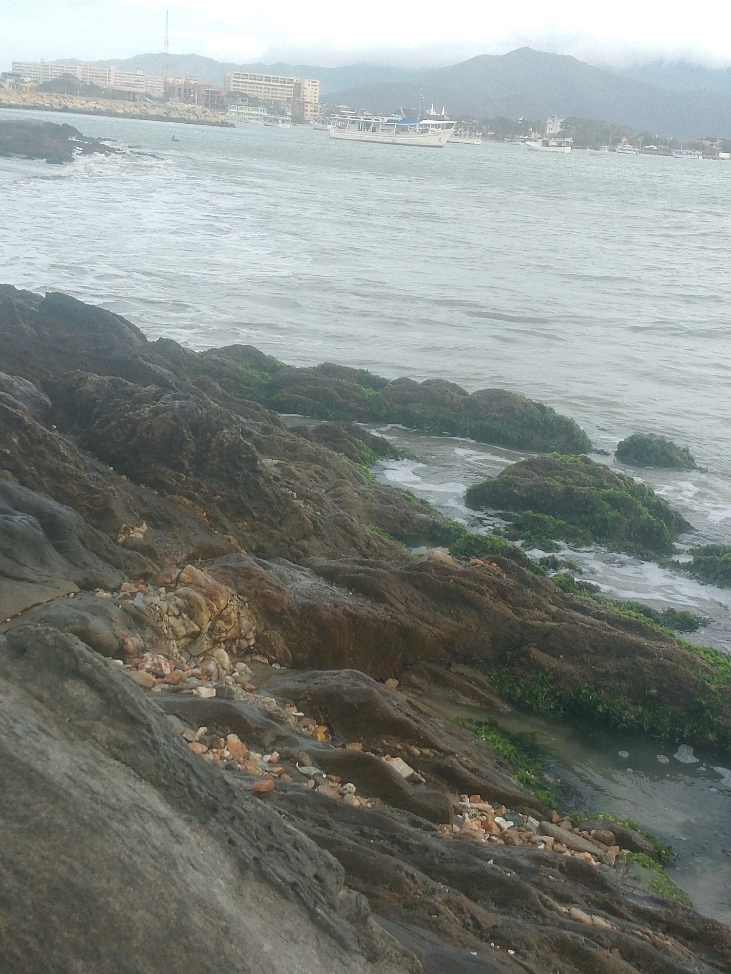 The image shows a rocky shoreline at La Galera in Juan Griego, Venezuela. The foreground is dominated by rocks, some covered in moss and algae, sloping down towards the water. Some loose pebbles and s…read more