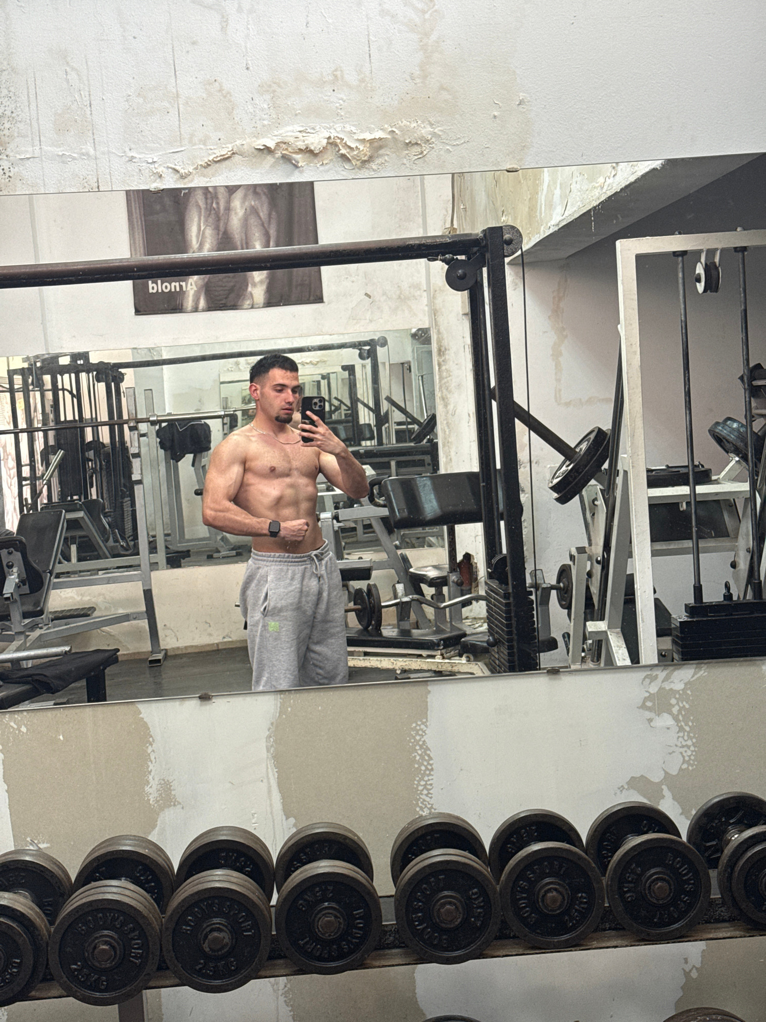 A shirtless man with a lean, muscular physique is captured in a mirror selfie within what appears to be a gym. He is wearing light grey sweatpants and a smartwatch on his left wrist, holding a black s…read more