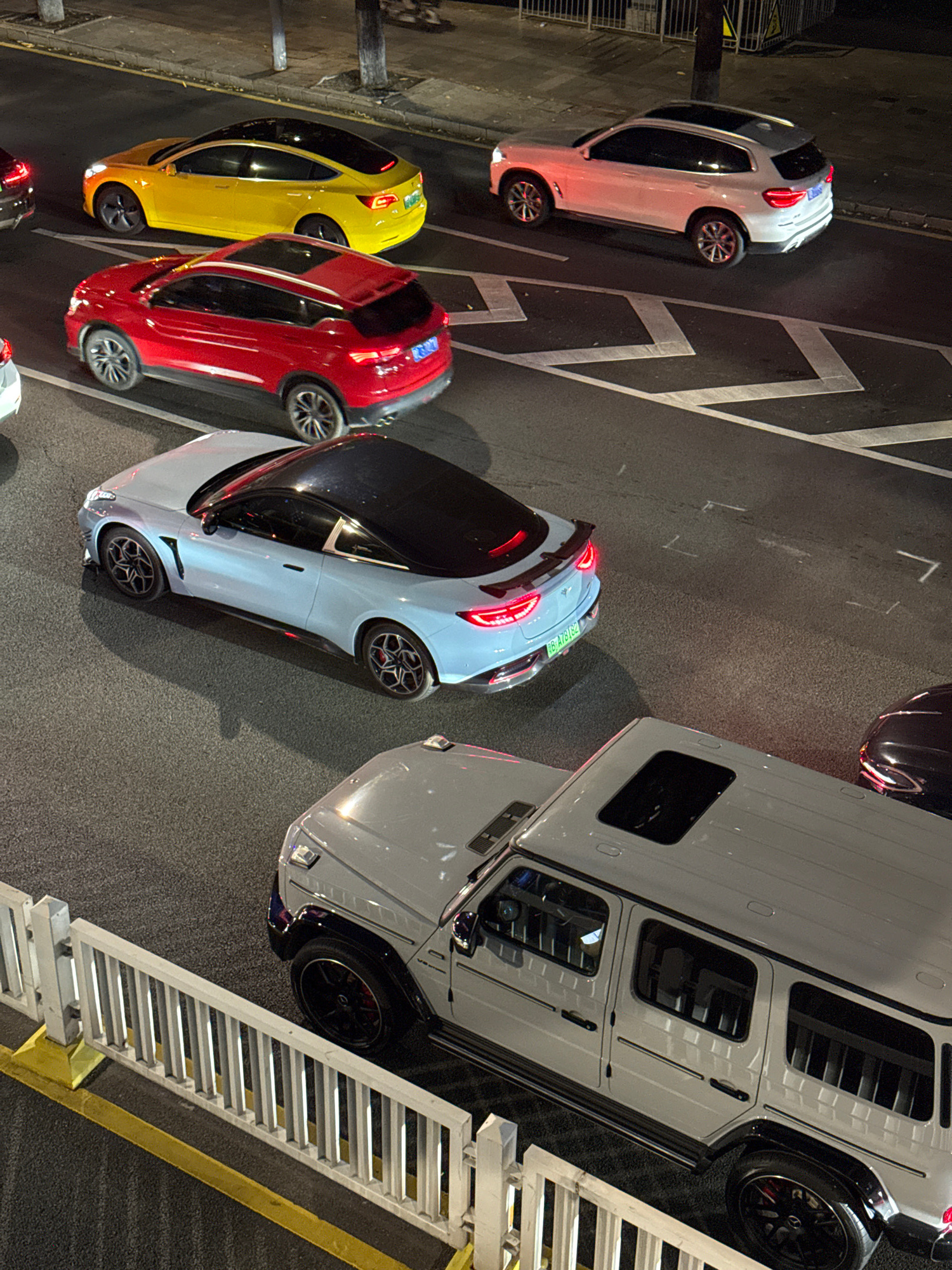 The image shows an overhead view of several cars parked on asphalt in what is potentially the Futian District in China. A white SUV, possibly a Mercedes-Benz G-Class, occupies a significant portion of…read more