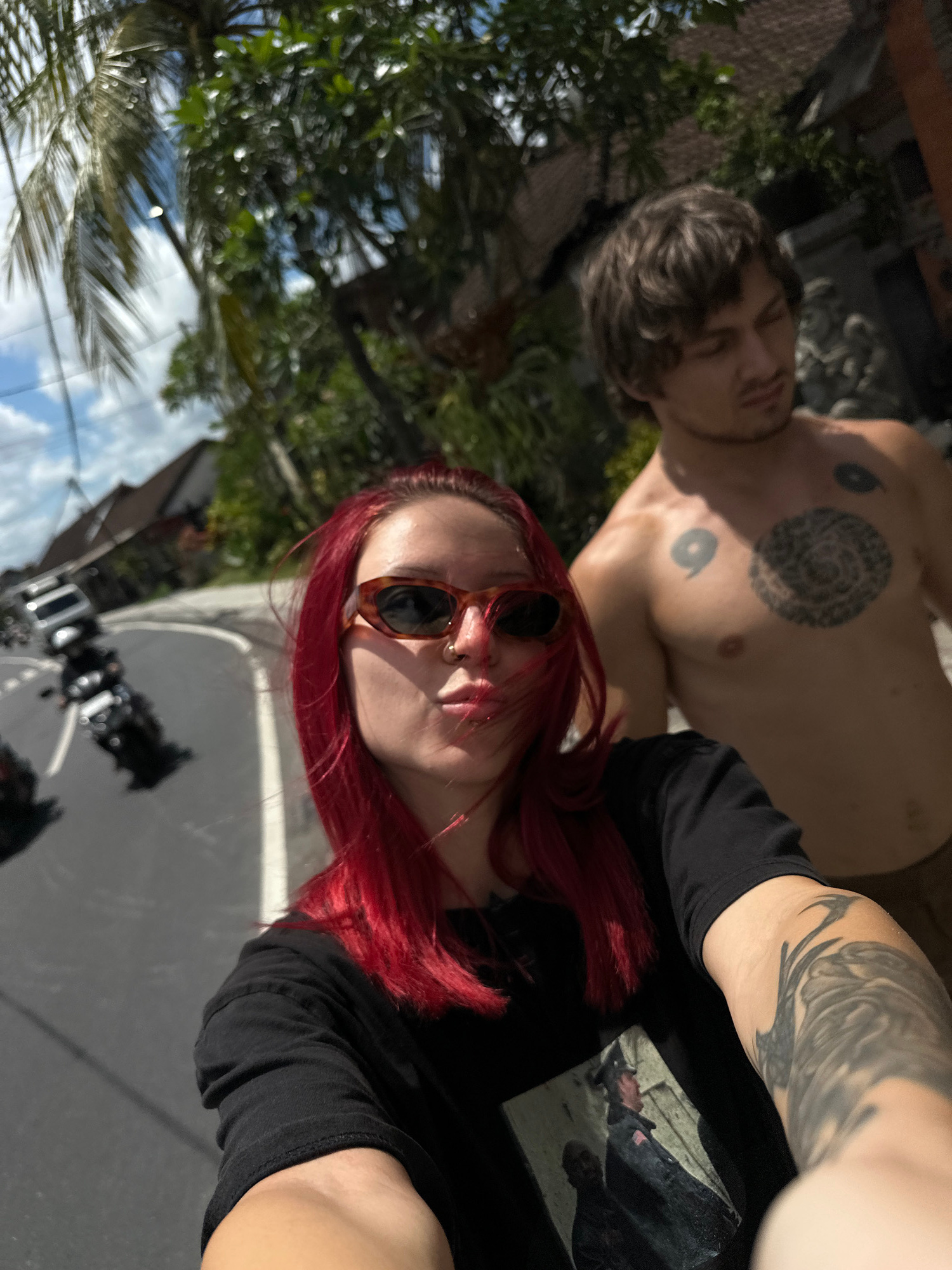 Two people are in the image. One shirtless person with tattoos is behind a person with red hair and sunglasses wearing a black shirt, who appears to be holding the camera. There are trees and building…read more