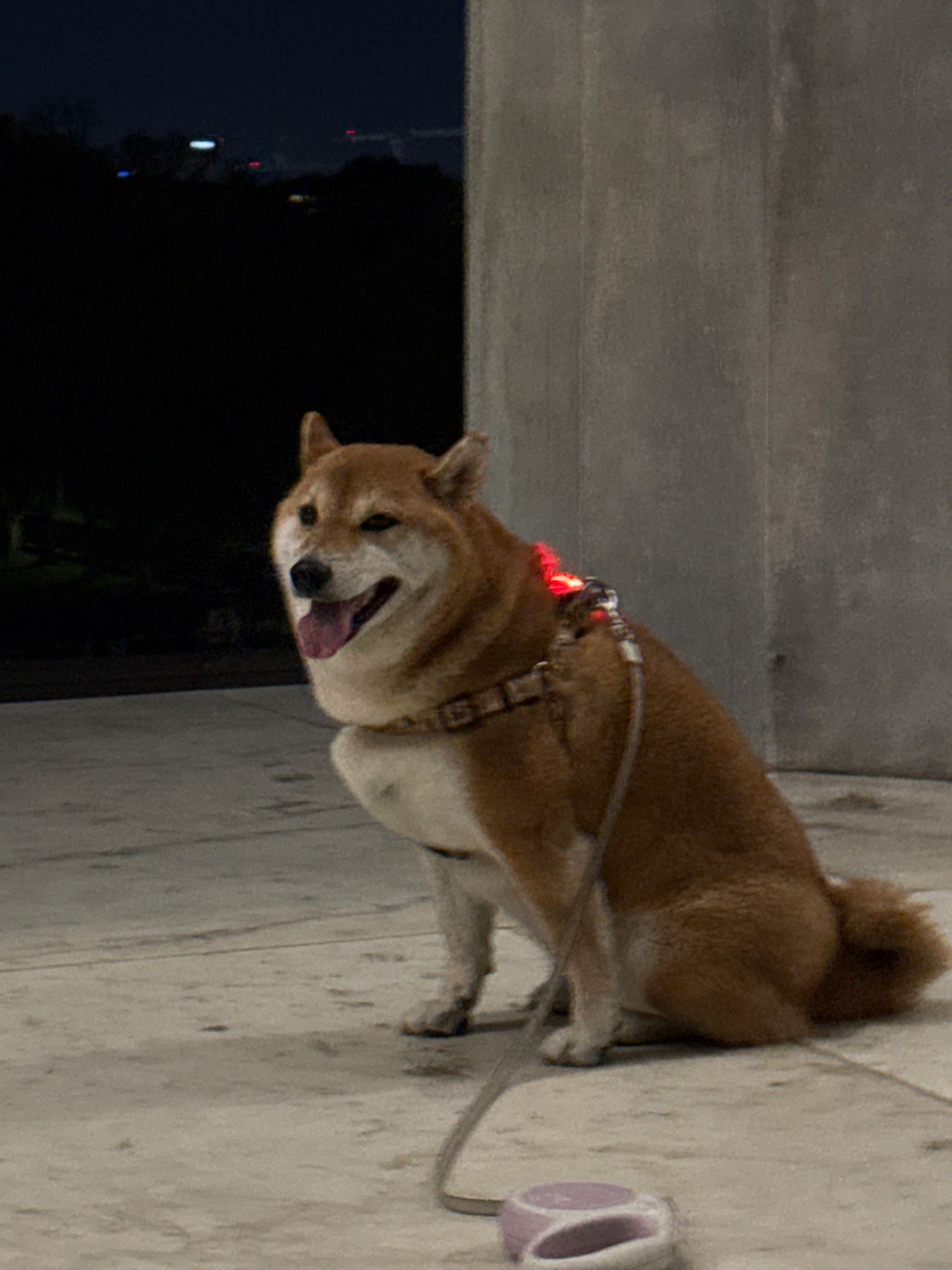 A medium-sized Shiba Inu dog with tan and cream coloring is on a leash, panting with its tongue out. It is standing on a light grey concrete surface. To the left of the dog is a dark area, likely repr…read more