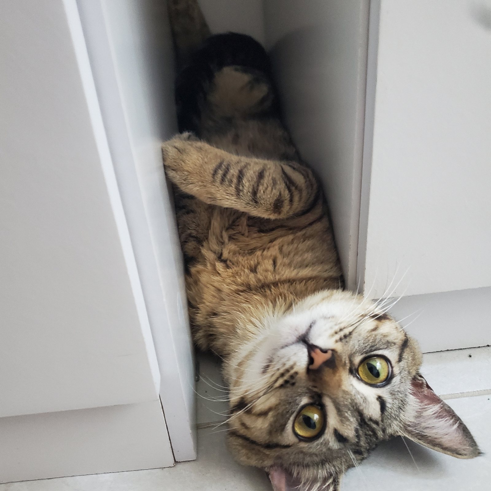 A tan tabby cat with green eyes lies on a white shelf. The cat's head is tilted, and it looks directly at the camera. The cat is indoors, on what appears to be a set of white shelves against a white t…read more