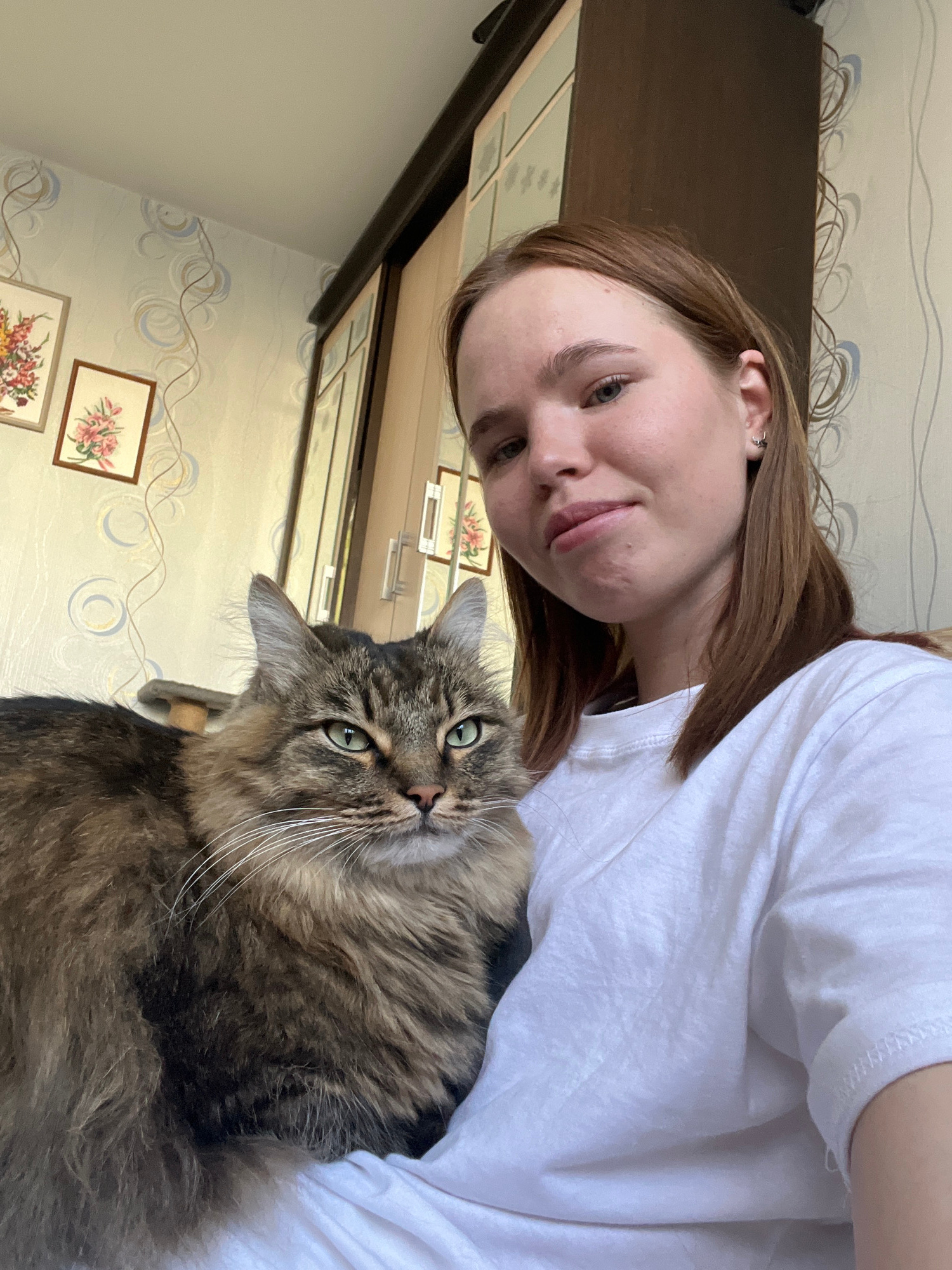 A woman is holding a brown and grey long-haired cat. The woman has brown hair and is wearing a white t-shirt. They are indoors in front of a wall with light wallpaper with blue and grey swirls and fra…read more