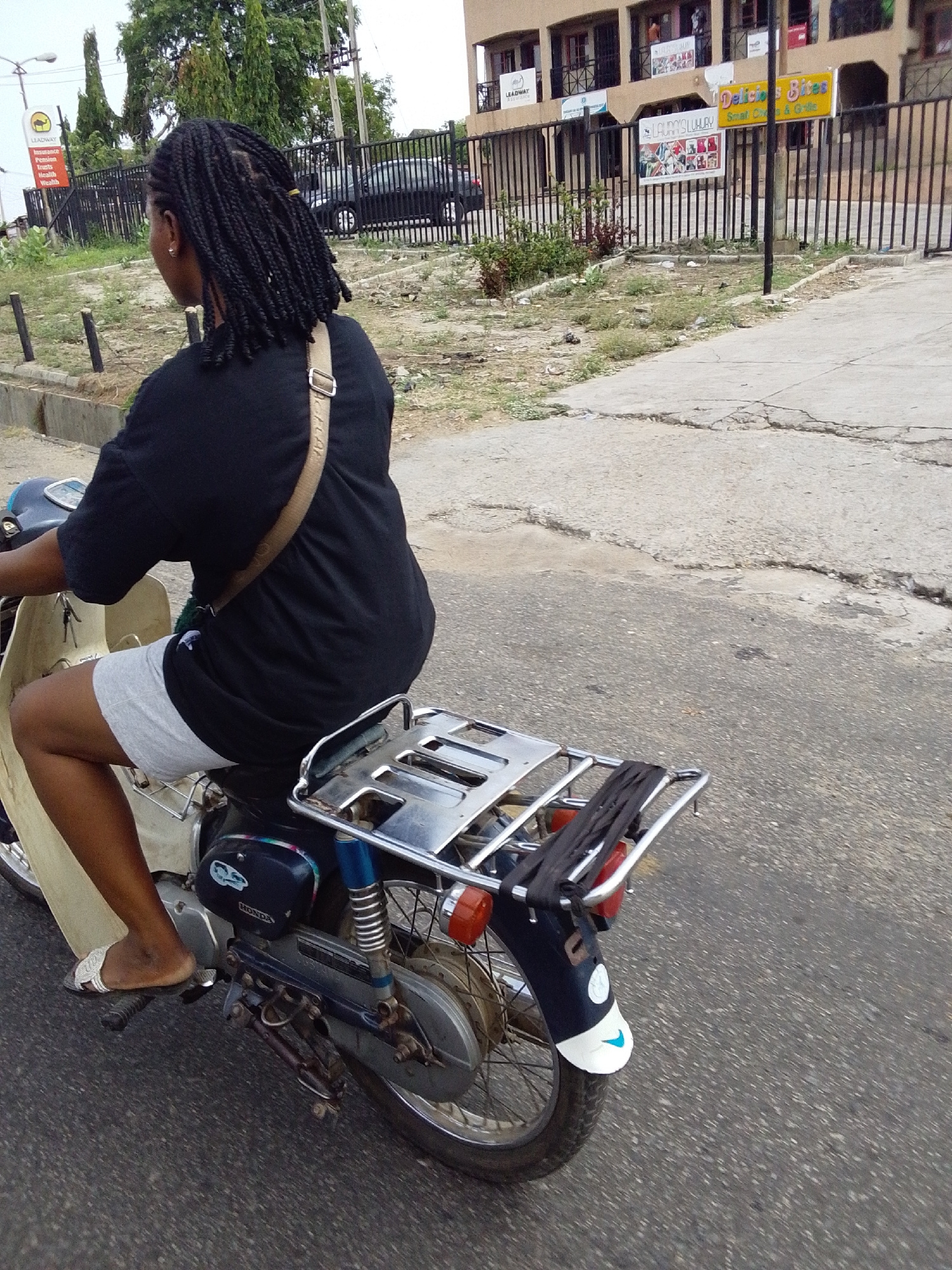 A person with braided hair, wearing a black t-shirt, gray shorts, and white sandals, is riding a blue and white Honda motorbike on a paved road in Lokoja, Nigeria. The motorbike has a chrome luggage r…read more