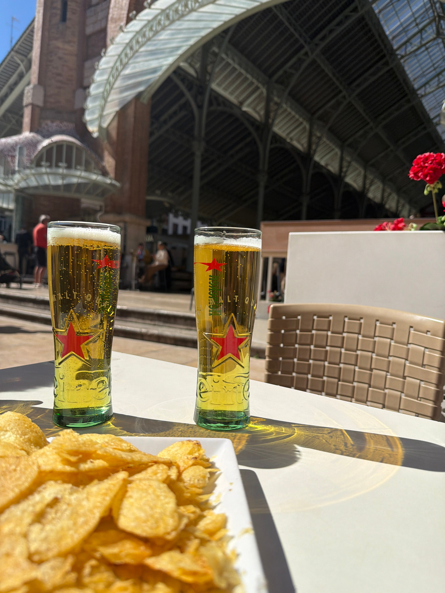 The image shows two glasses of Heineken beer with foam, placed horizontally on a white table alongside a white plate filled with potato chips. The beer glasses prominently display the Heineken logo with a red star. Behind the table, a light beige wicker chair is visible. The background features the architectural structure of the Central Market of Valencia, Spain, characterized by its iron and glass facade, indicating that the picture was taken at or near this location. Some people can be seen in the background. The daylight suggests it is an outdoor setting. | Open Wire