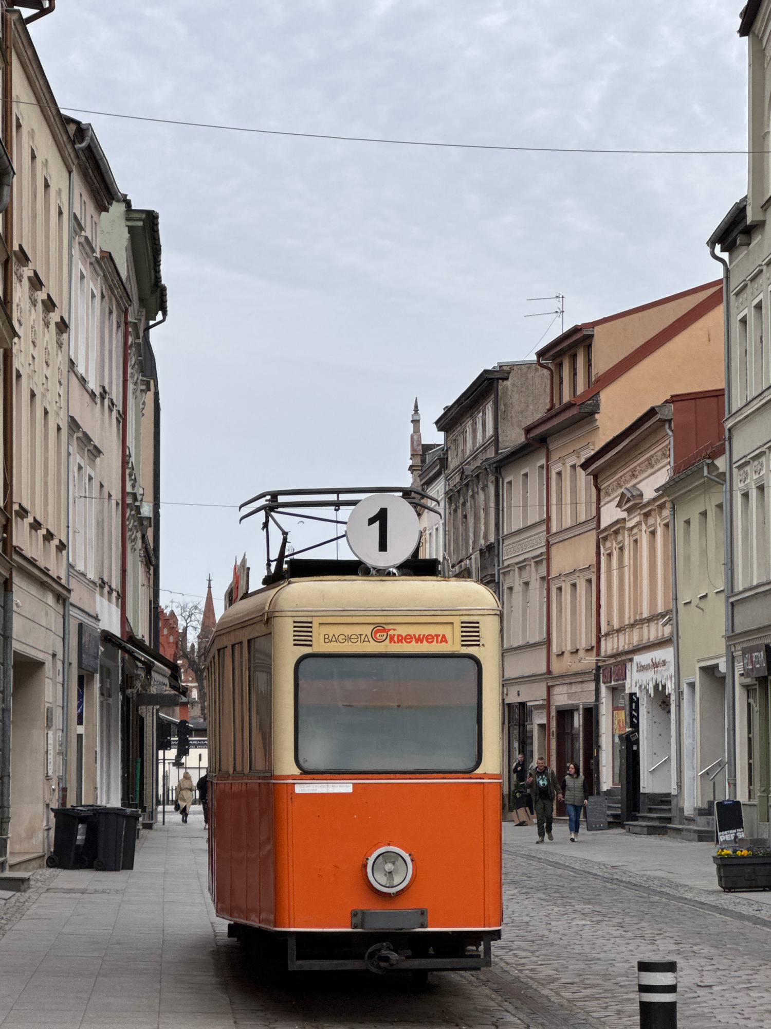 The image shows a street view in Bydgoszcz, Poland, featuring an orange and cream colored tram with the number 1 displayed prominently. The tram has "BAGIETA KREWETA" written on its side. The street i…read more