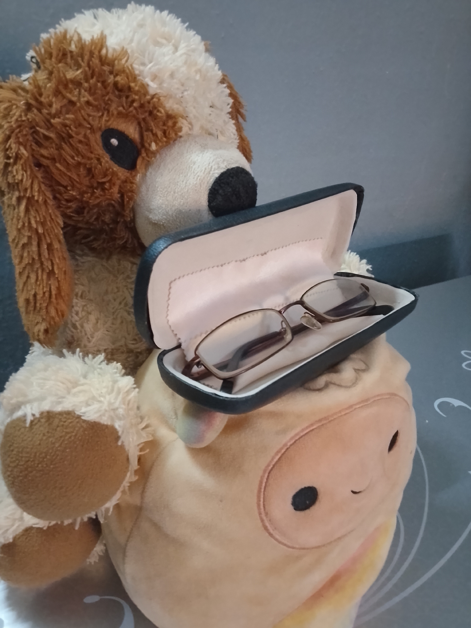 A stuffed brown and white dog sits behind a tan stuffed pig. A black eyeglasses case sits open on the head of the pig, revealing a pair of brown-rimmed eyeglasses inside. The background is a gray wall…read more