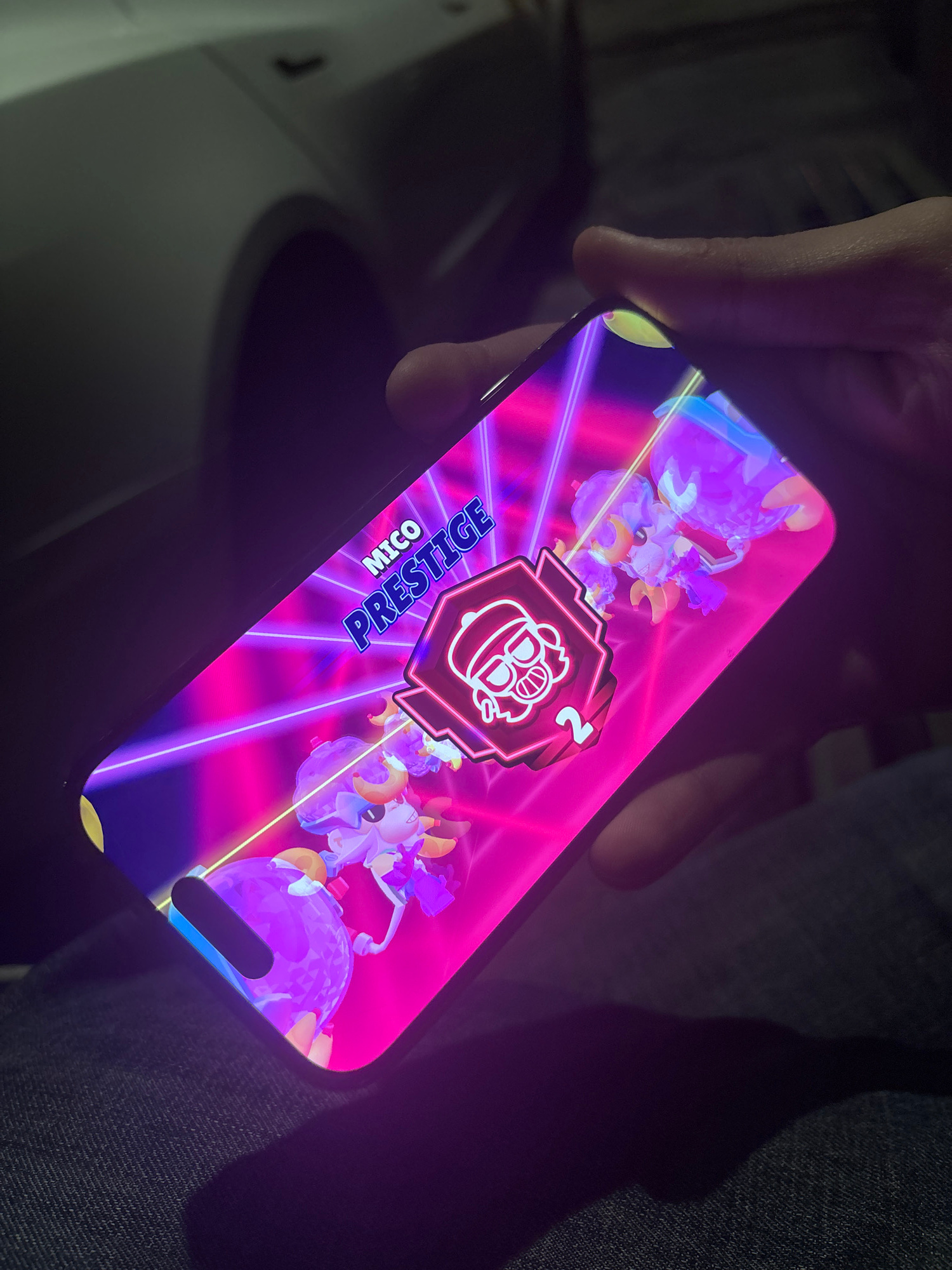 The image shows a hand holding a smartphone displaying a game screen. The game appears to be "Brawl Stars", specifically showing the "Mico Prestige 2" character. The background is a vibrant mix of pin…read more