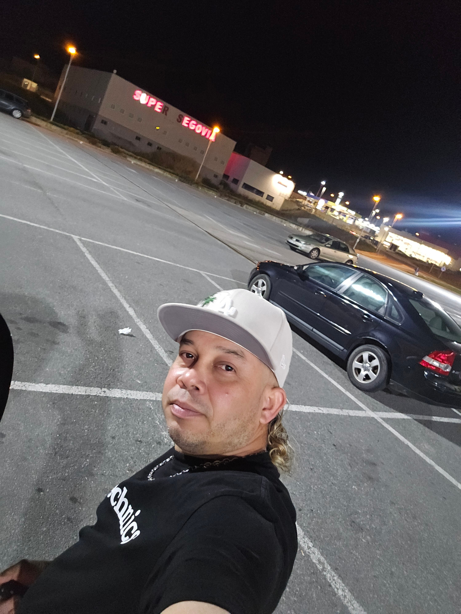 The image is a low-angle selfie taken at night in a parking lot near a building with the sign "SUPER SEGOVIA" in Segovia, Spain. A man is visible in the left foreground wearing a black shirt with whit…read more