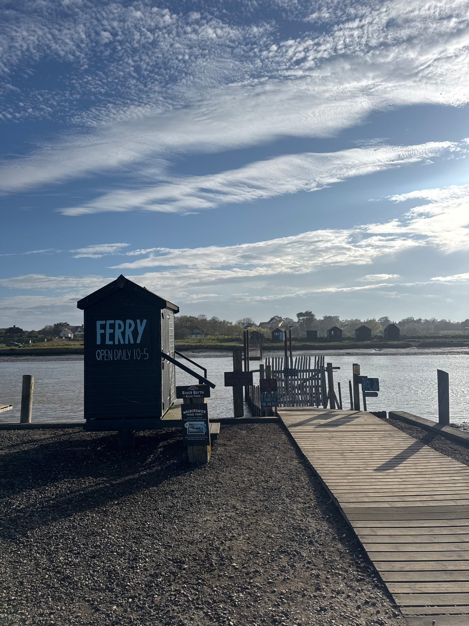 The scene captures the Walberswick Ferry station in East Suffolk, United Kingdom. A small wooden building stands prominently with "FERRY" painted on its side, accompanied by the text "OPEN DAILY 10-5"…read more