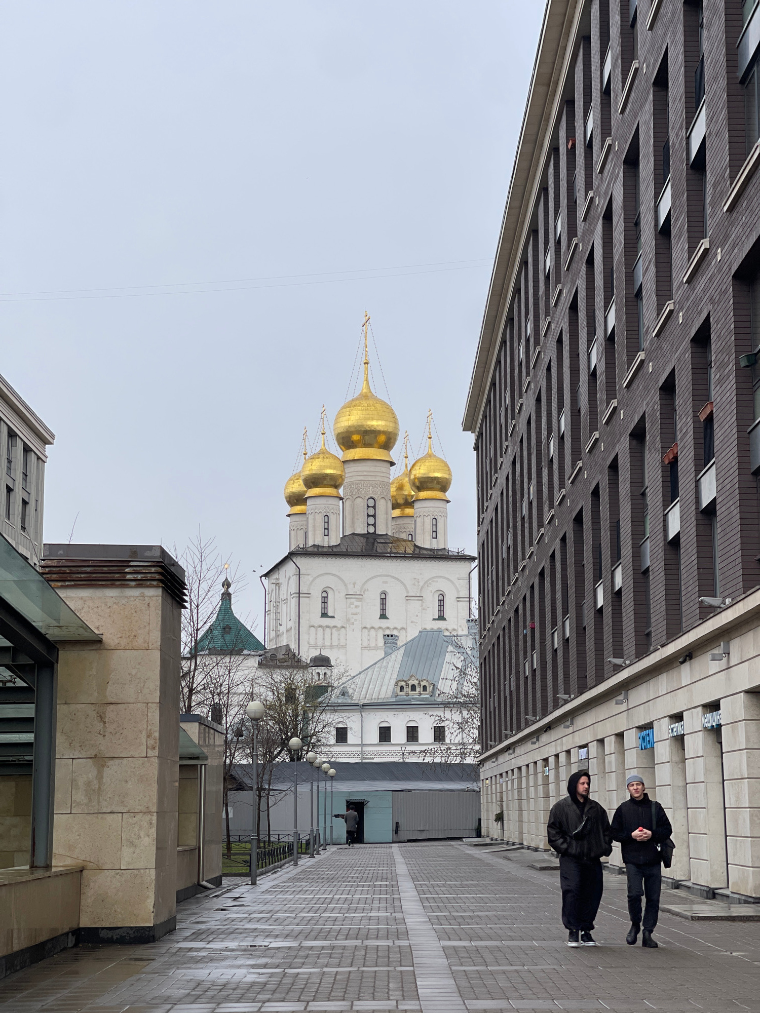 The image shows a view of Saint Petersburg, Russia, angled upwards. In the center, a white building with golden domes is visible. A modern building with a grid-like facade is on the left. On the rightβ¦read more