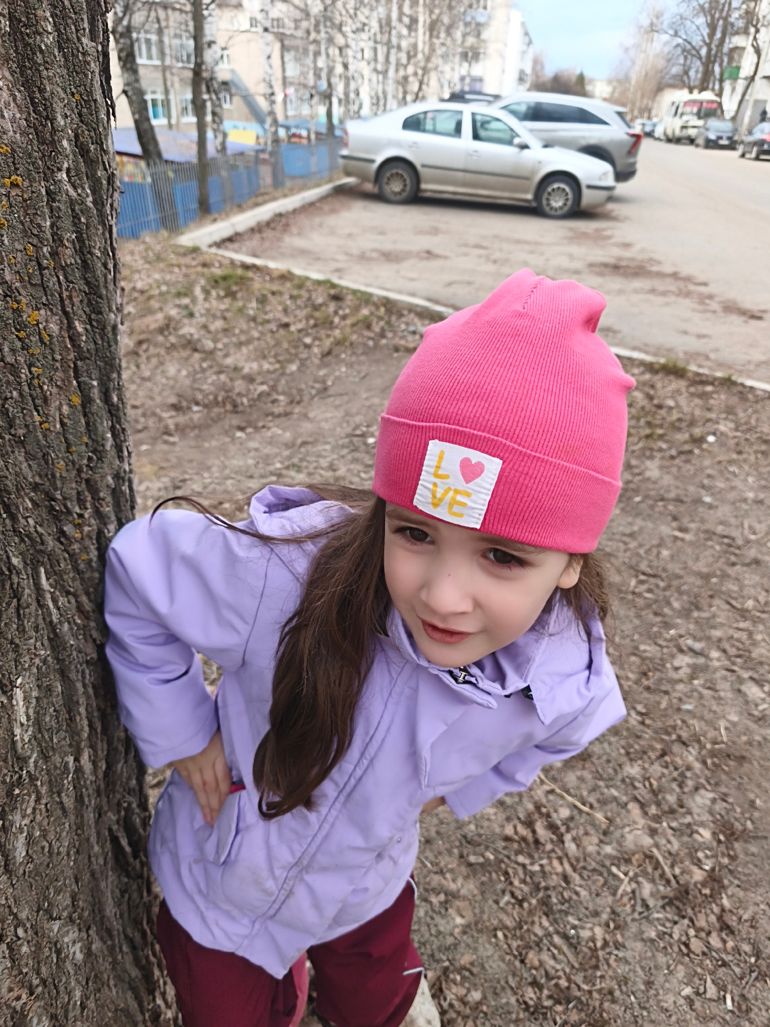A young girl is depicted outdoors, playfully leaning against a large tree trunk and looking up towards the viewer with a slight smile. She is wearing a vibrant pink knit beanie hat with a white rectan…read more