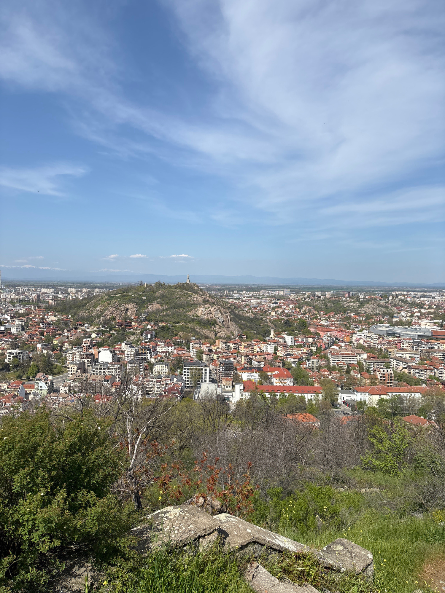 The image presents a panoramic, elevated view overlooking the city of Plovdiv, Bulgaria, under a bright daytime sky. The perspective is from a natural, rocky outcrop, likely a hill or mountain, provid…read more