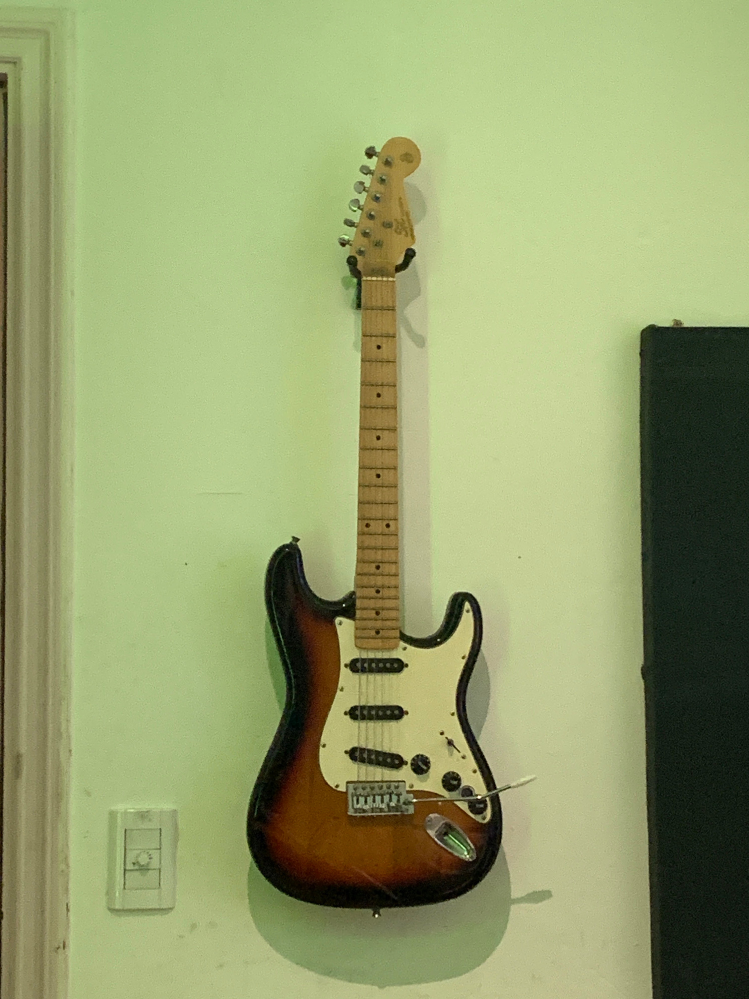 The image shows an electric guitar mounted on a light green wall. The guitar has a sunburst finish and a white pickguard. Above the guitar is a dark rectangular object partially visible. Below the gui…read more