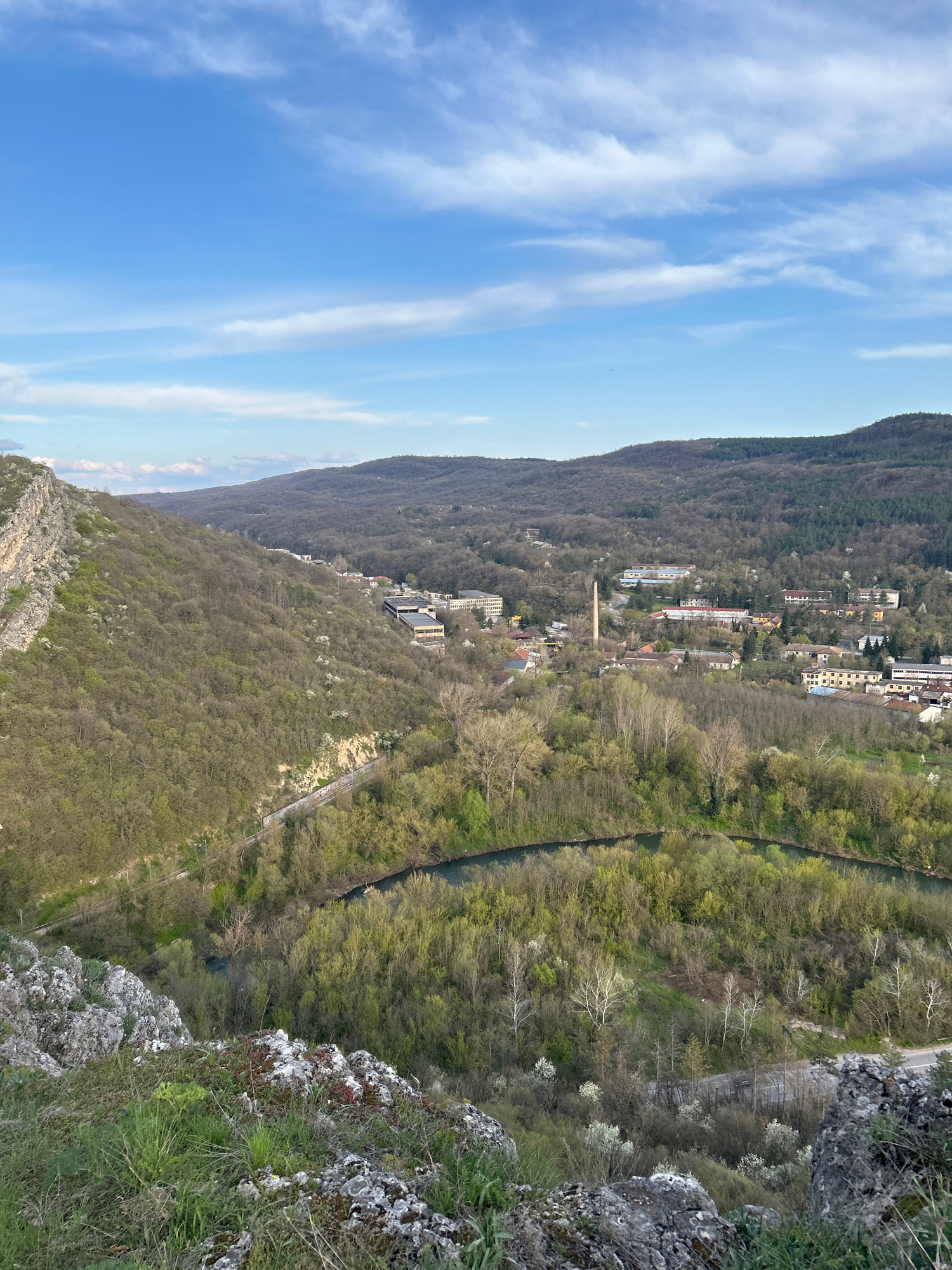 The image depicts a landscape with a view into a town in Veliko Tarnovo, Bulgaria. A river with a road beside it can be seen through trees in the valley. The foreground is a rocky cliff. Mountains are…read more