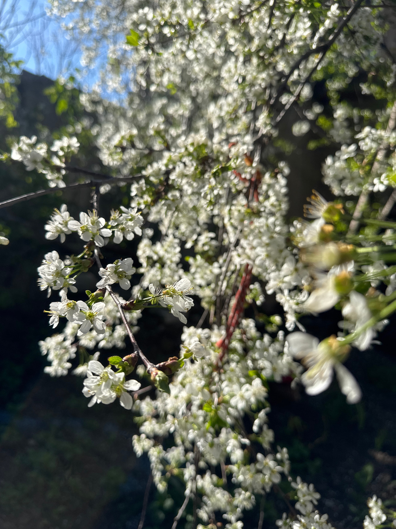 The image shows a tree in full bloom with white flowers, possibly cherry blossoms. The branches fill most of the frame, with the blossoms densely packed. The background is dark and out of focus, sugge…read more