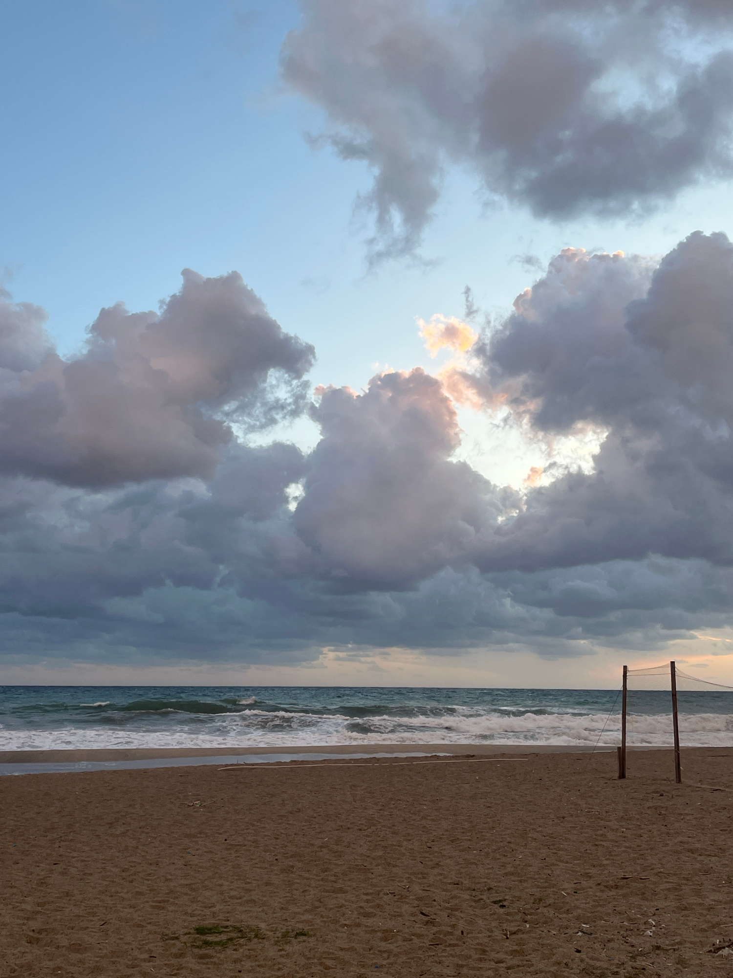 The image shows a beach scene. The sky is filled with dark, heavy clouds, with some areas of lighter blue sky and sunlight peeking through. The sea is rough, with waves crashing onto the shore. The sa…read more