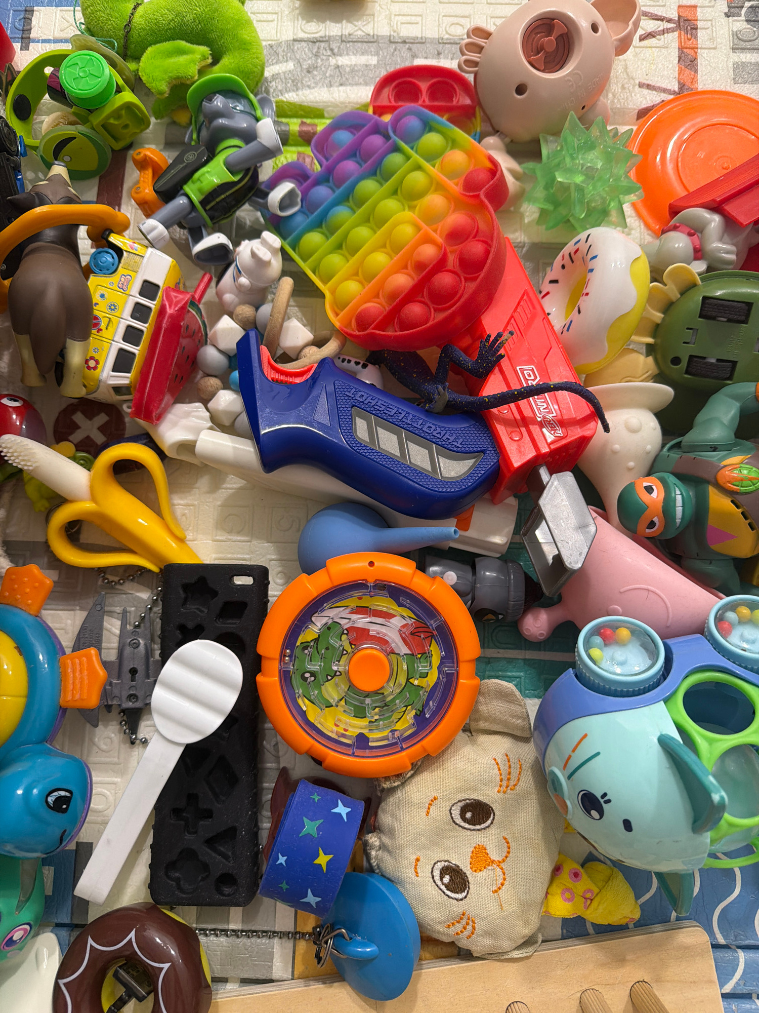 The image shows a close-up of a collection of toys, including a toy blaster, a "pop-it" fidget toy, a plush elephant head, a toy car, a toy turtle, and other miscellaneous plastic toys. The toys appea…read more