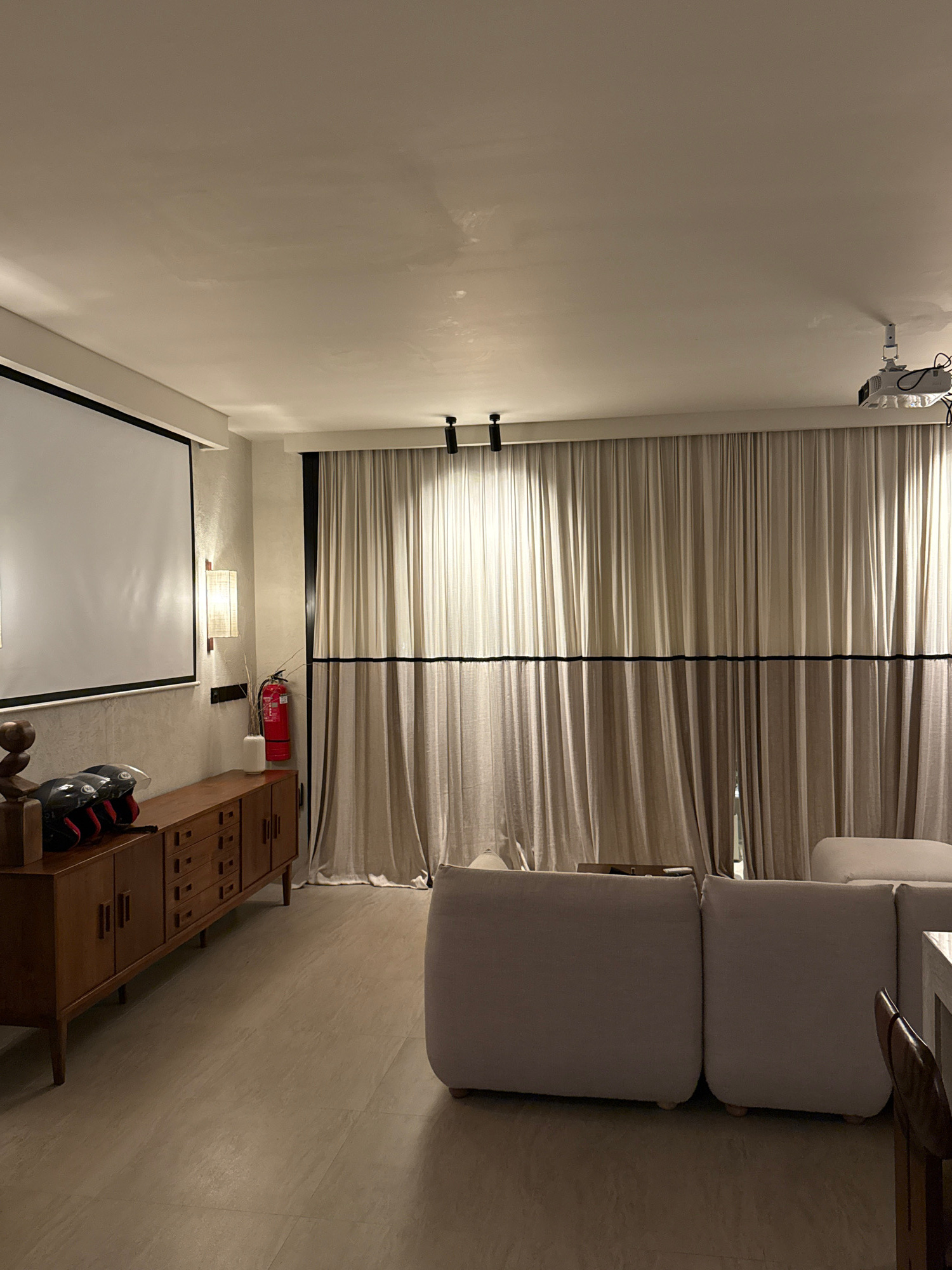 The image depicts an interior space, possibly in a residential or entertainment setting. A white projector screen is visible on the left side of the frame. Above the screen is a wall-mounted light fix…read more