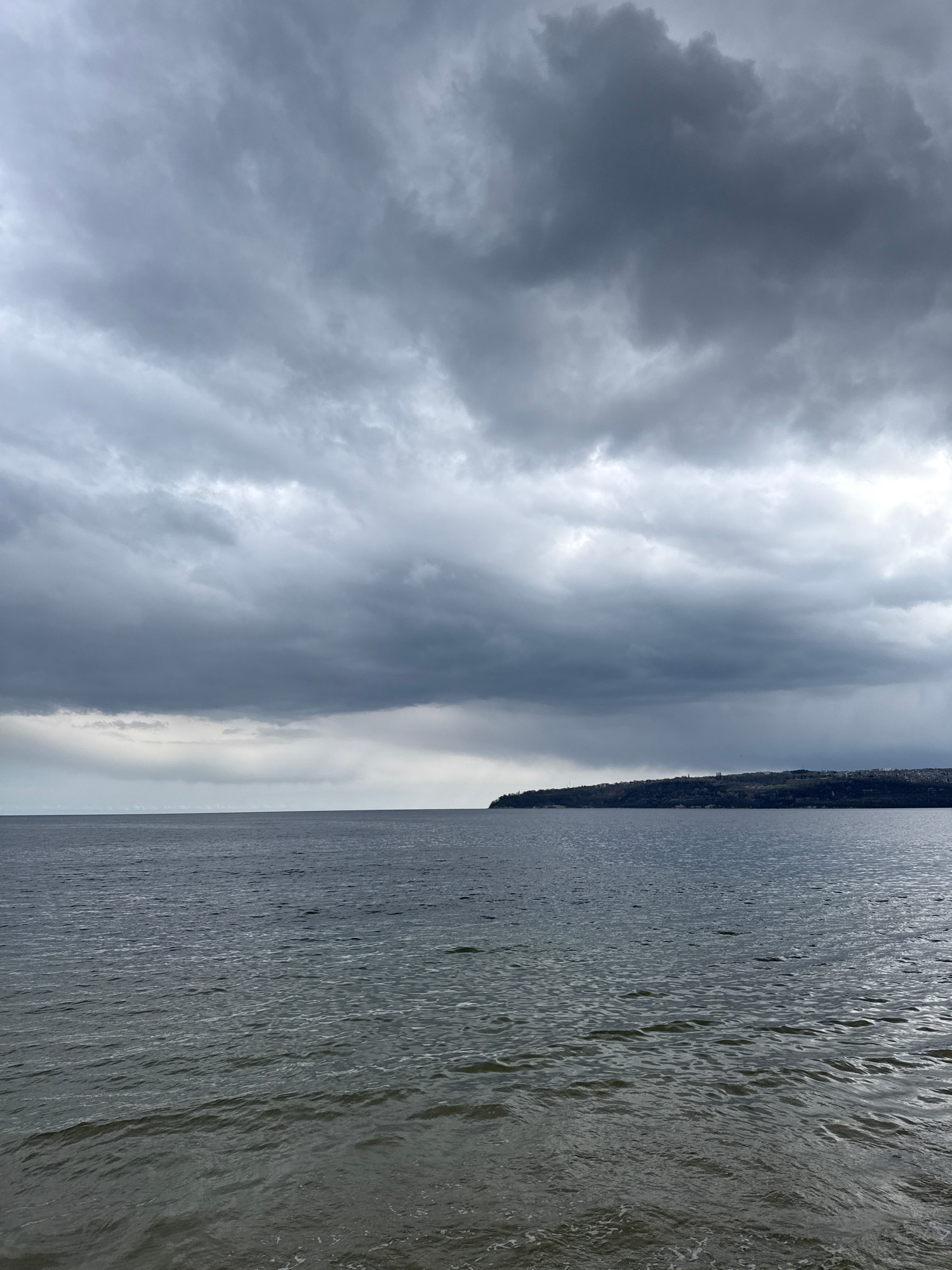 The image presents a seascape under a heavily clouded sky. To the right, the water, likely a part of the Black Sea near Varna, Bulgaria, shows a rippled surface. A strip of land with dense vegetation…read more