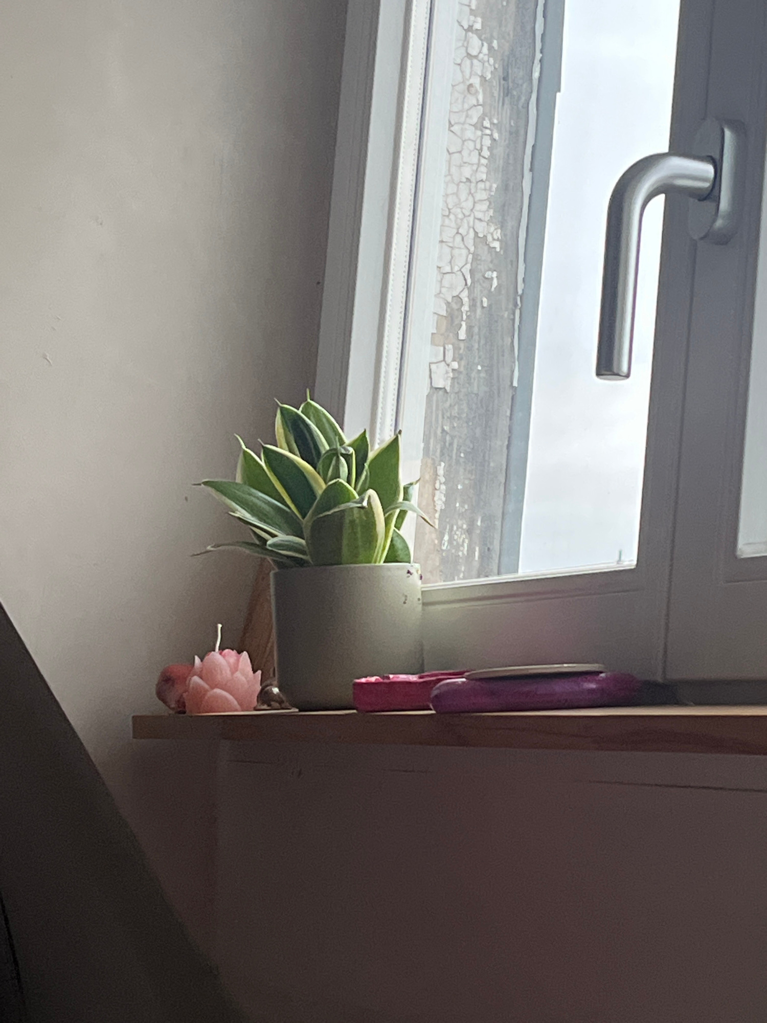 The image shows a plant in a white pot sitting on a wooden shelf inside a window frame. The leaves of the plant are green and white striped. A pink artificial flower is visible behind the pot, and a p…read more