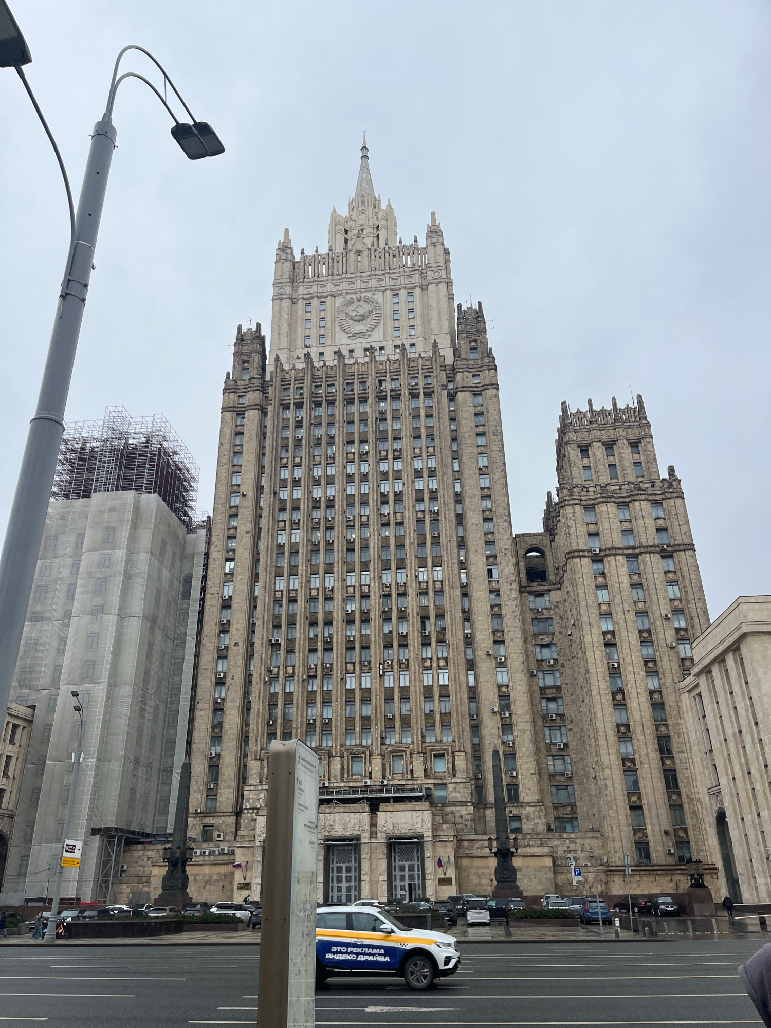 The image shows a tall, gray building in Moscow, Russia, under an overcast sky. The building has numerous windows and a prominent spire at the top, characteristic of Stalinist architecture. Scaffoldin…read more