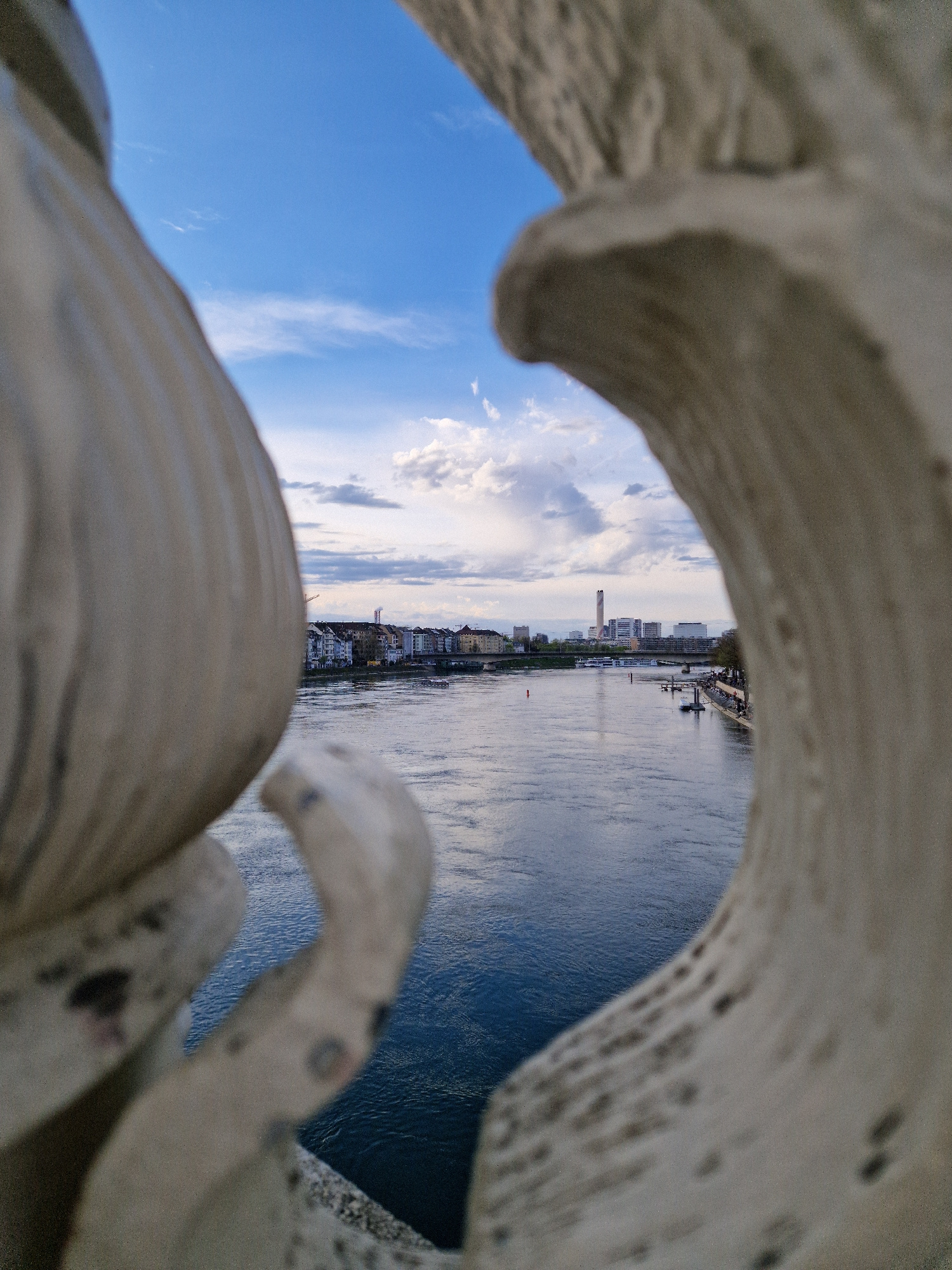 The image shows a view of the Rhine River and the Basel skyline through a stone sculpture or architectural element. The sky is blue with some clouds. The Rhine River is visible with a city skyline vis…read more