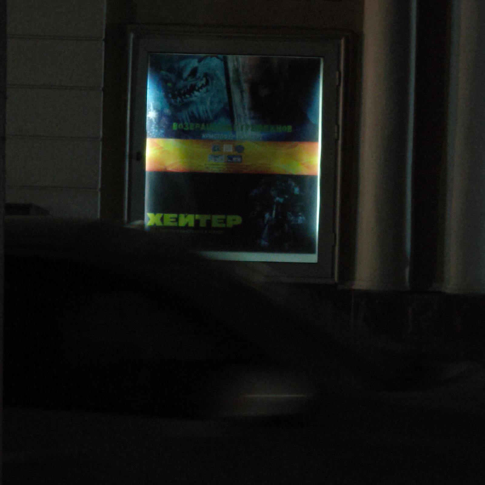 This image depicts a nighttime urban street scene in Hrodna, Belarus, focusing on a brightly illuminated poster displayed within a window frame. The poster features a dark, monstrous creature with pro…read more