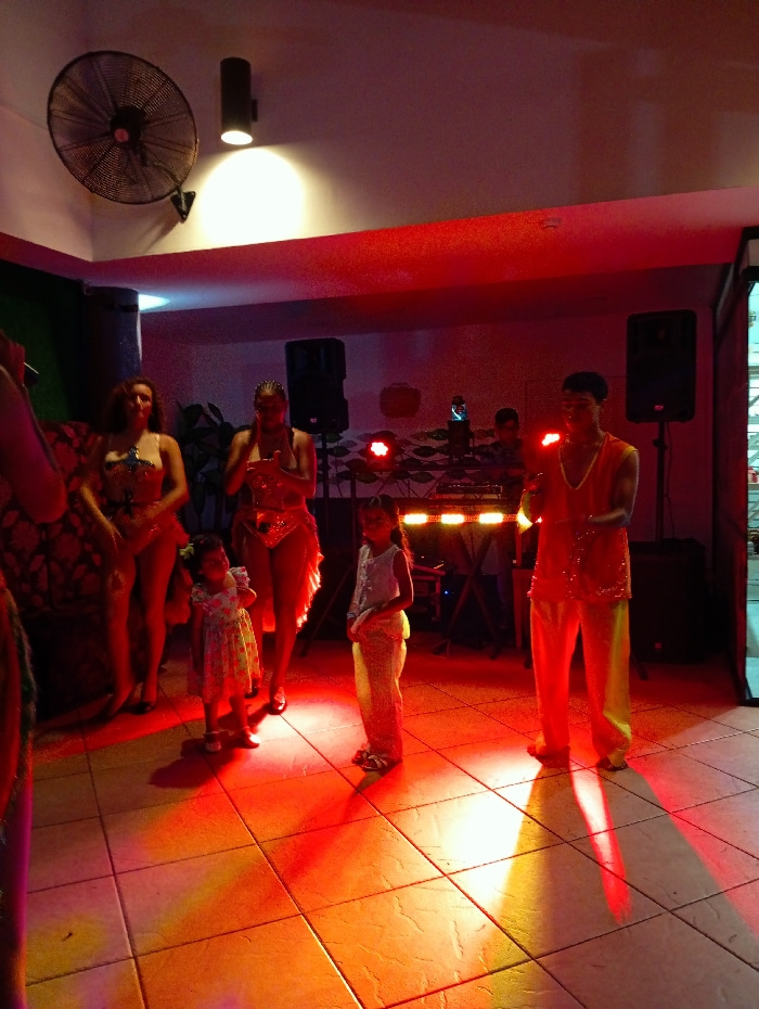 The image depicts an indoor entertainment venue in Playa El Agua, Venezuela, under stage lighting characterized by dominant red and orange hues on the tiled floor and subjects. Six individuals are pre…read more
