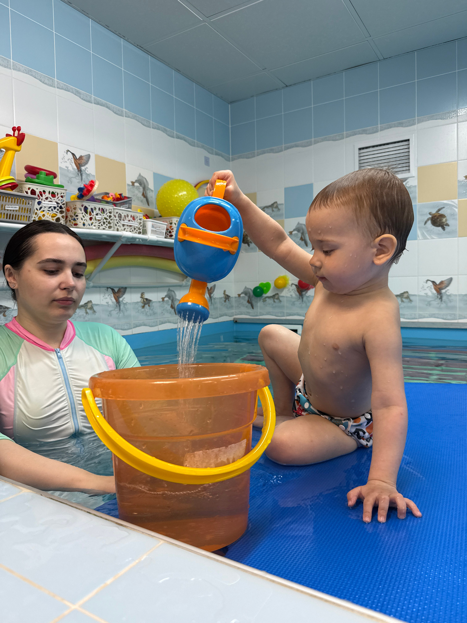 A young child is kneeling on a blue mat, pouring water from a blue and orange watering can into a clear orange bucket held by a woman. The woman is wearing a white and pastel rash guard. The scene app…read more