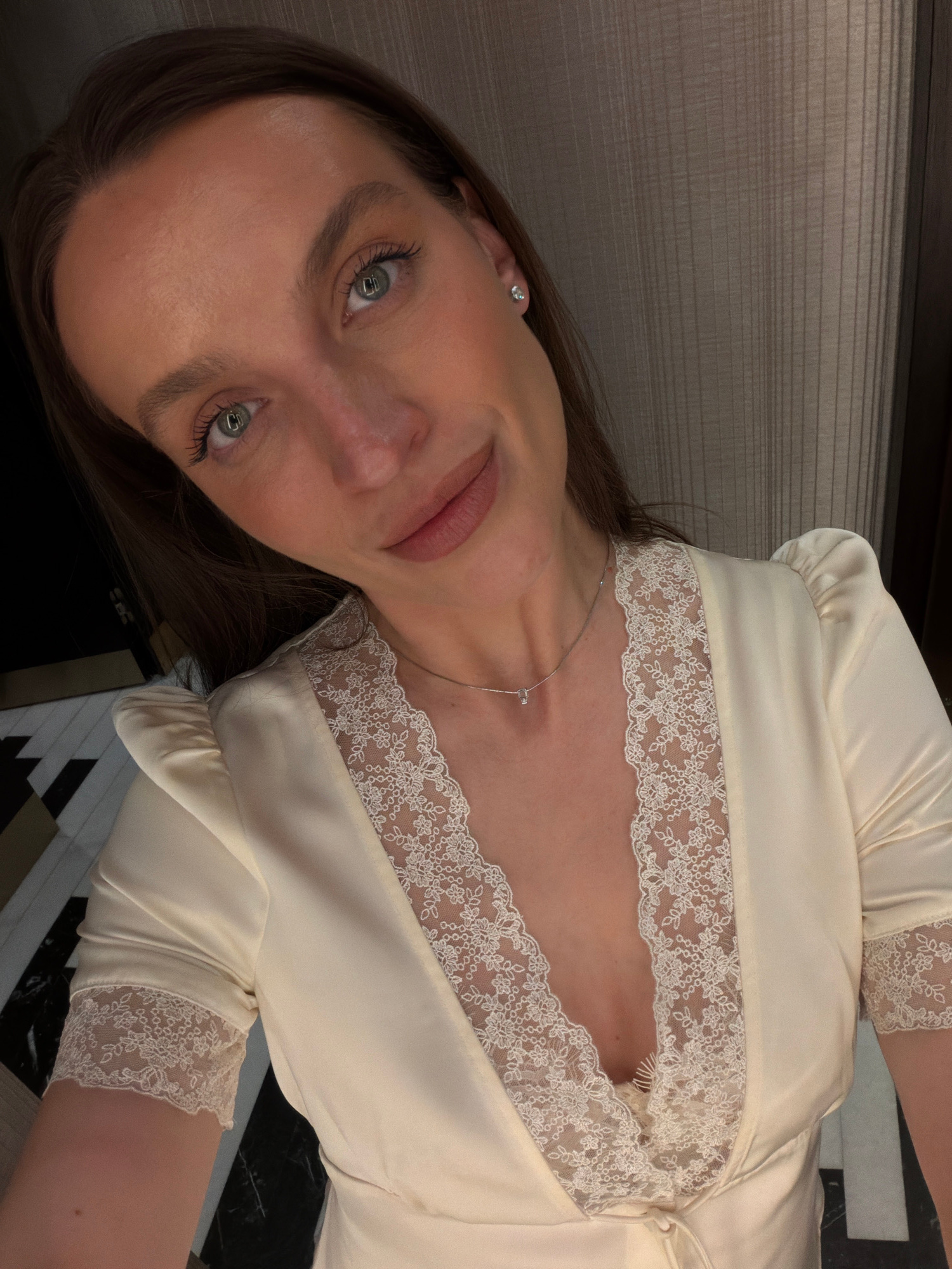 A woman is posing for a close-up selfie while inside. She is wearing a light-colored satin robe or dress trimmed with white lace. The top of a dark wooden cabinet or molding is visible in the backgrou…read more