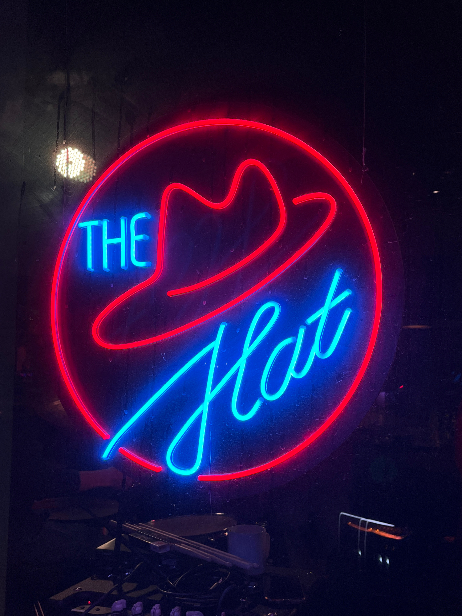 A neon sign displaying the words "The Hat" in Saint Petersburg, Russia is illuminated in red and blue. The word "The" is displayed in vertical orientation and blue in color. The image of a hat and the…read more