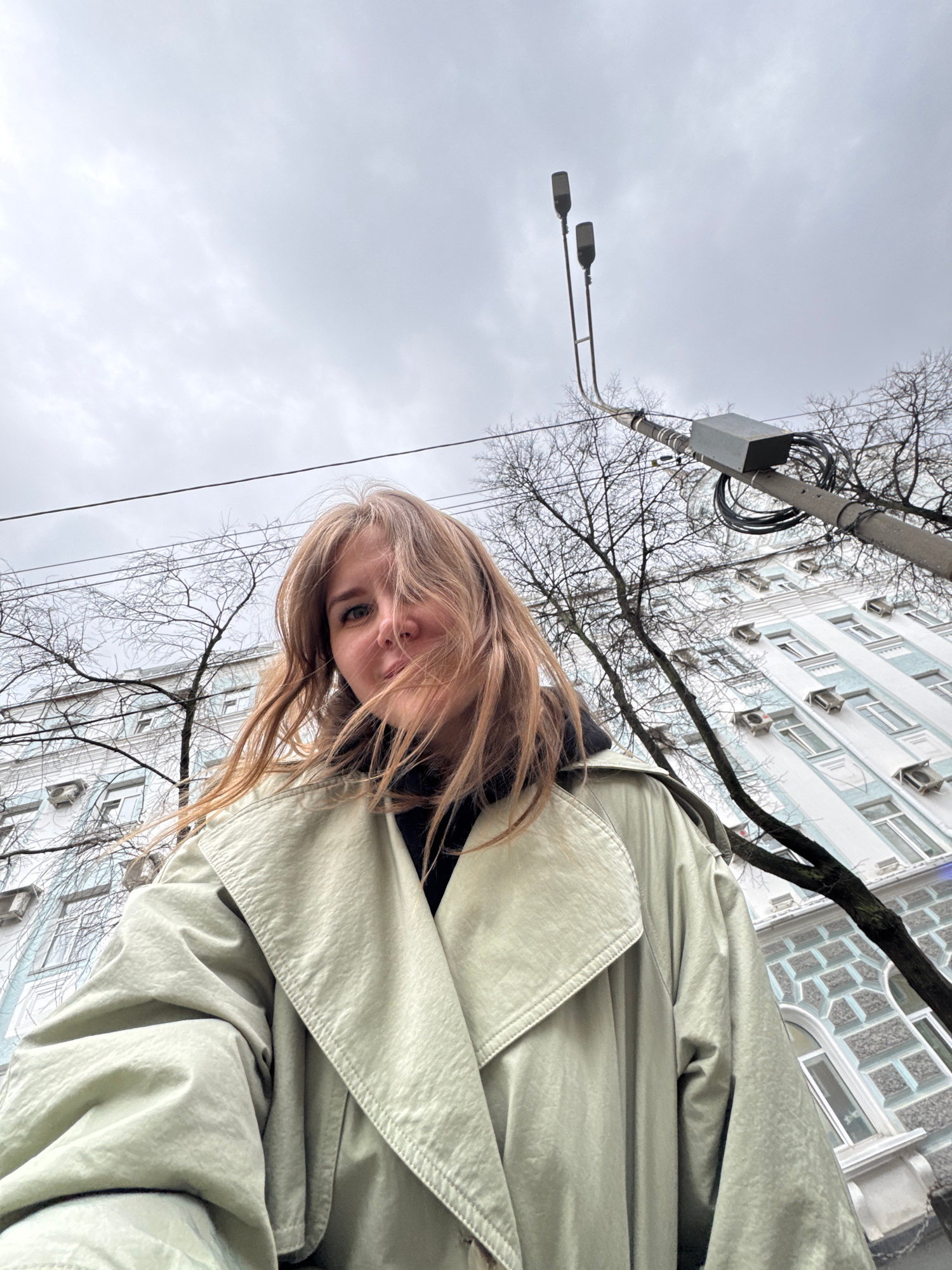 A medium-shot of a fair-skinned person with blonde hair and green eyes, wearing a light green trench coat and a black turtleneck sweater, looking up at the camera. The person is outdoors, in a city, w…read more