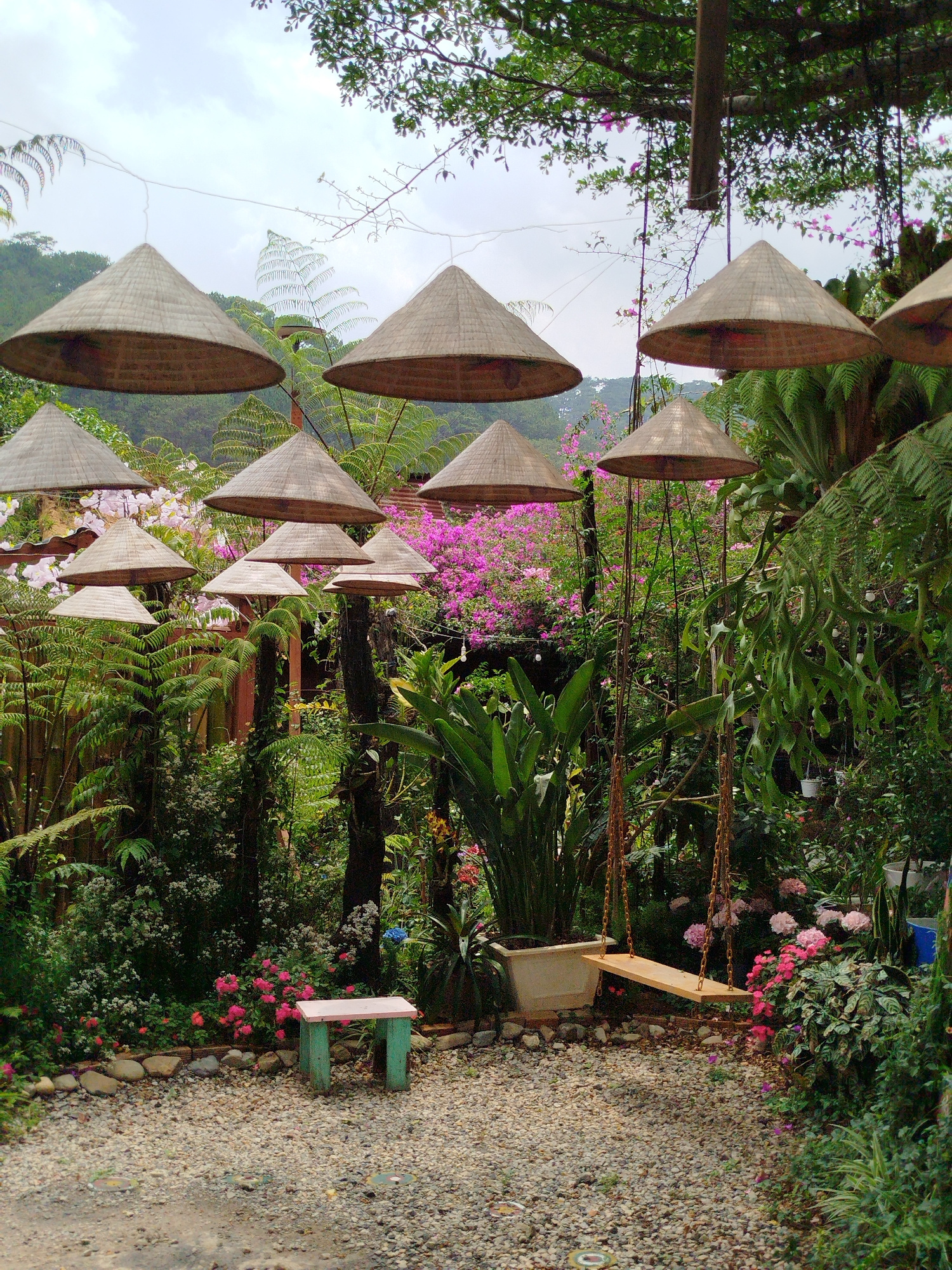 The scene presents an outdoor area in Da Lat, Vietnam, characterized by a garden setting. Numerous straw hats are suspended above, serving as decorative elements. The location features a swing with a…read more