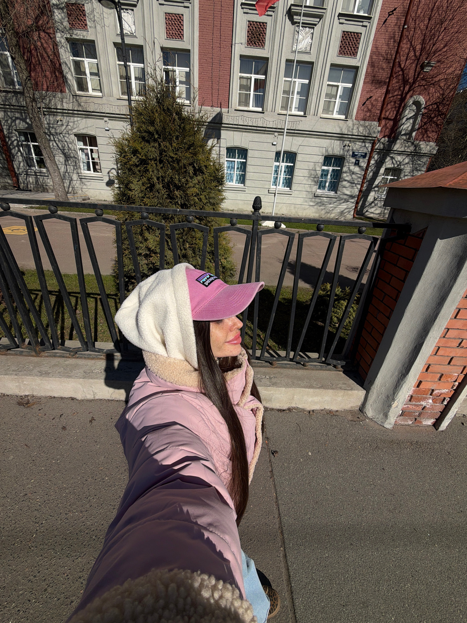 A medium shot of a woman wearing a pink Patagonia baseball cap, a white hood, a light pink jacket, and blue jeans. She is standing next to a black metal fence with a concrete base, possibly leaning onβ¦read more