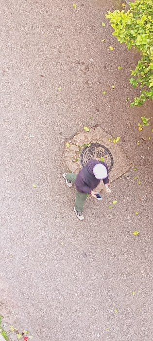 Aerial view of a person standing near a manhole cover. The person wears a white hat, a dark jacket, and green pants. They are holding a white object and a phone. The manhole cover is surrounded by a s…read more