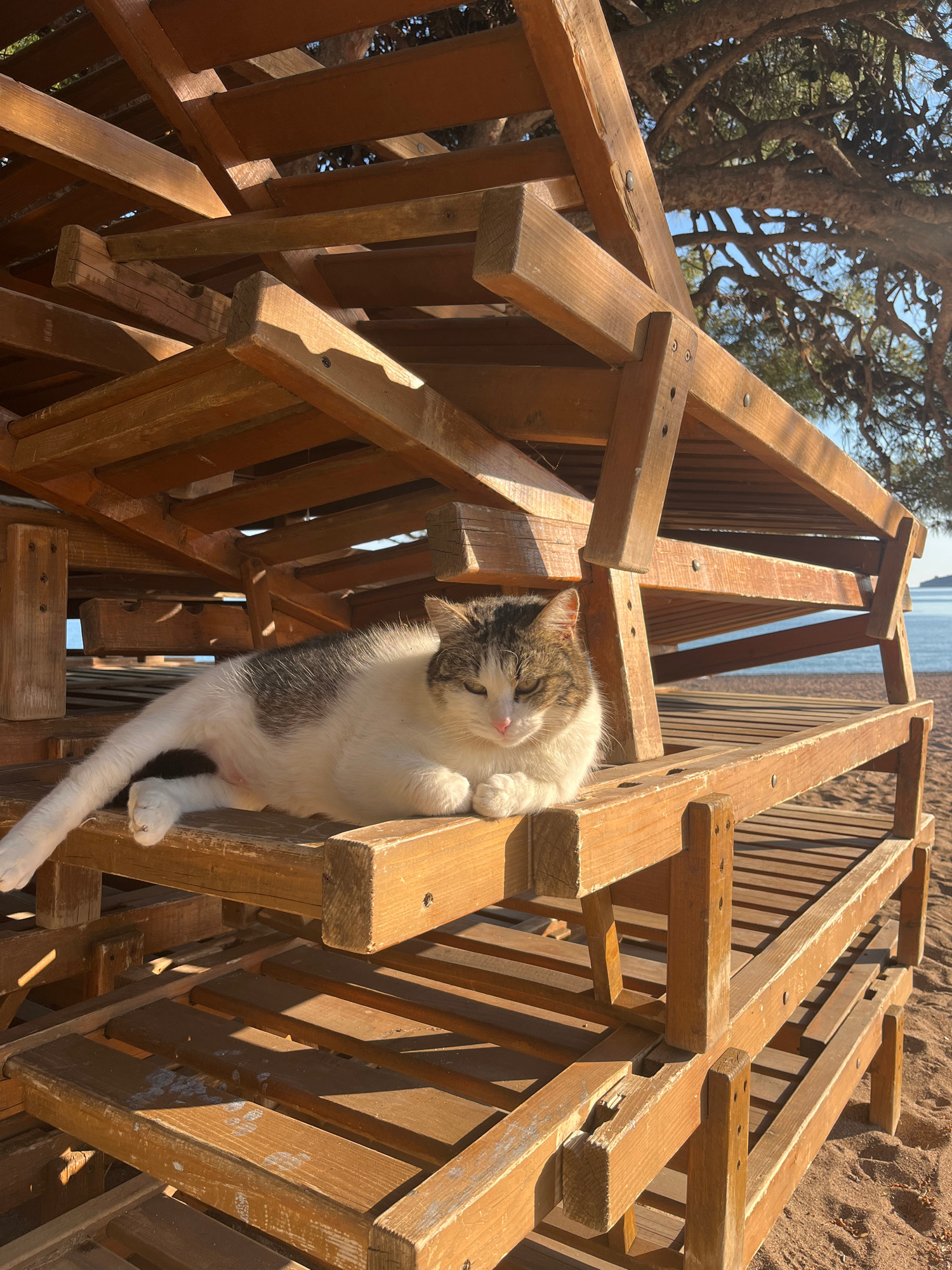 A medium shot shows a white and grey cat lying on a stack of weathered wooden lounge chairs or beach beds on a sunny day, possibly outdoors near a beach. The cat is nestled in the structure of the cha…read more