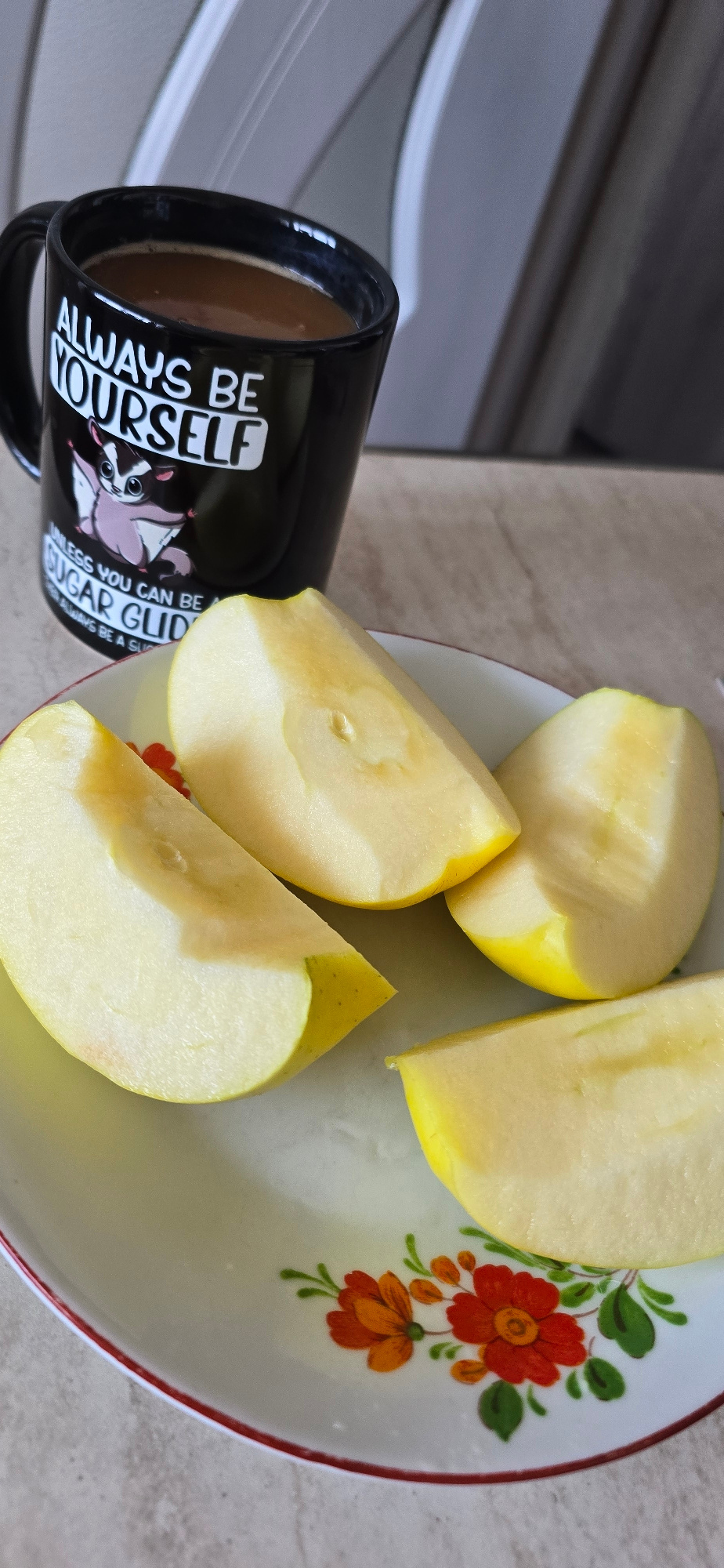 The image captures an indoor scene, likely a kitchen or dining area, set in Burgas, Bulgaria. A light-colored countertop serves as the surface for a simple snack or light meal. In the foreground, a b…read more
