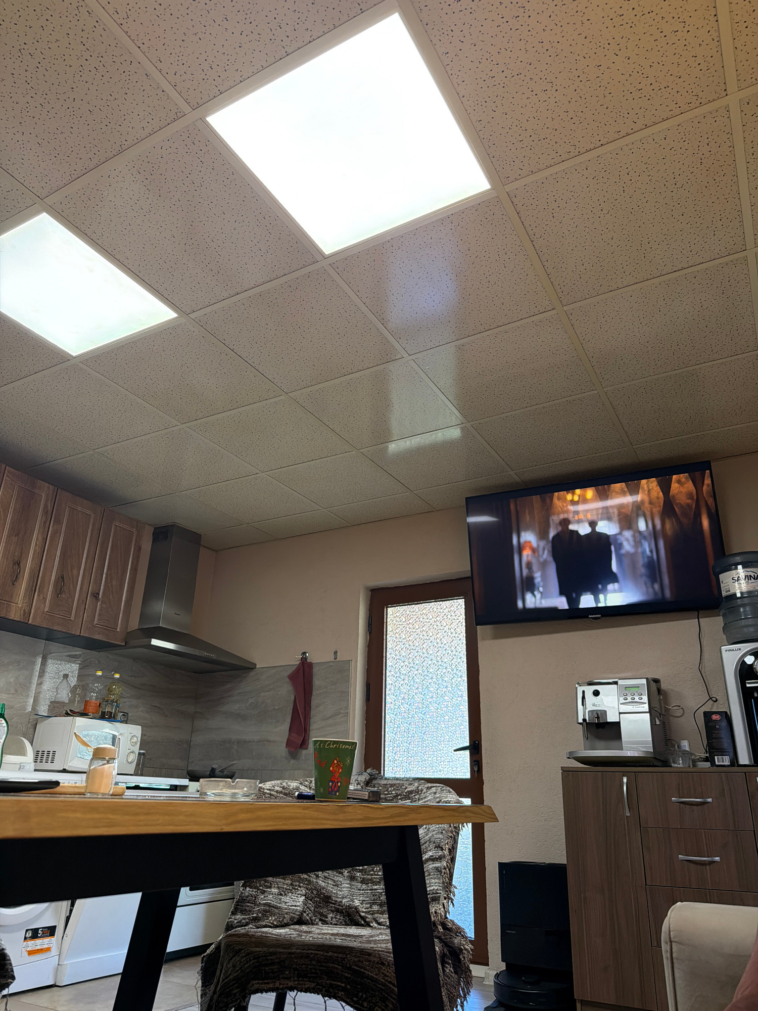 The image shows an interior with a drop ceiling and integrated lights. A flat-screen television is mounted on the wall, showing an image. Above the TV is a water cooler. To the right of the TV are kit…read more
