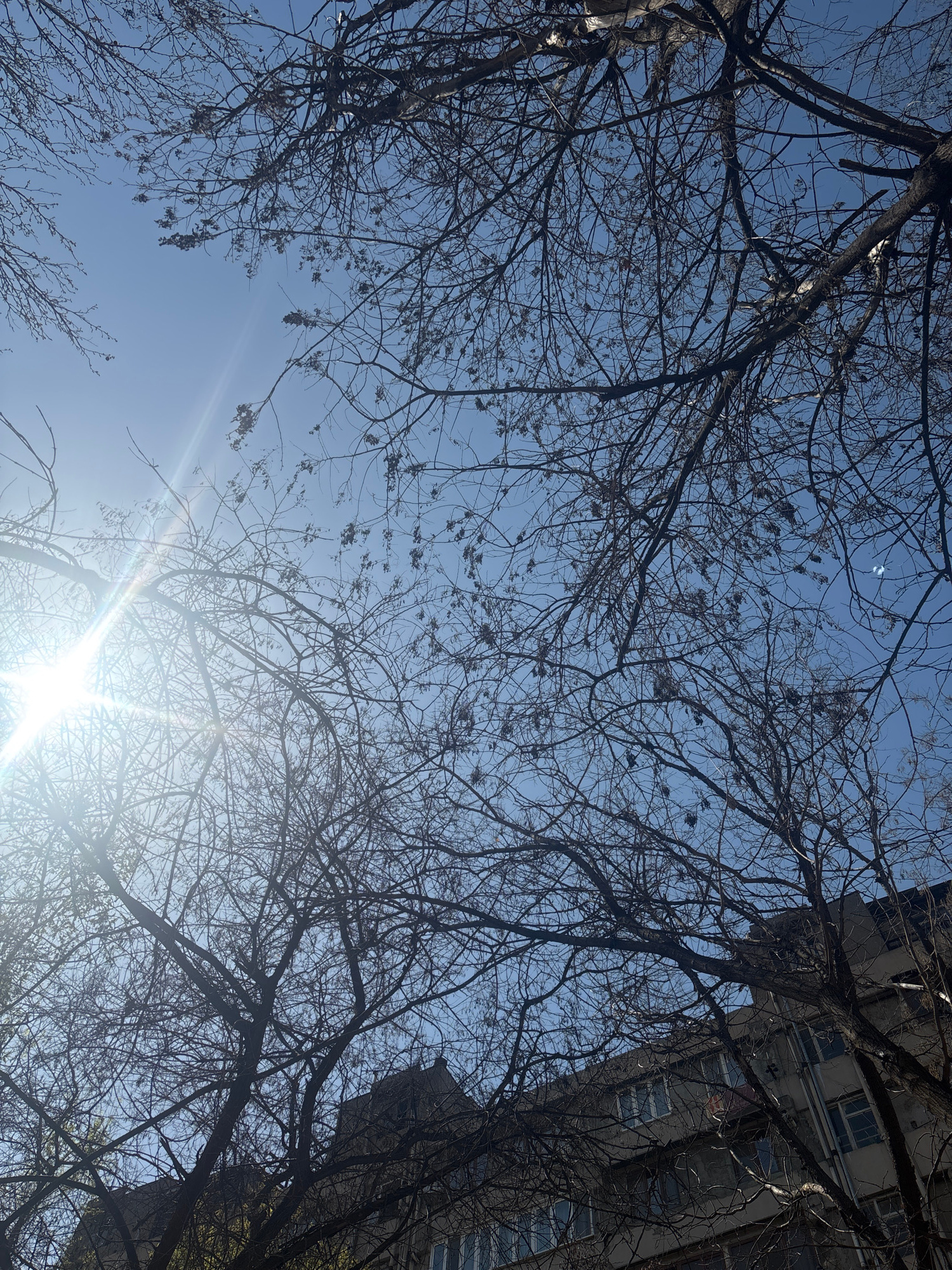 The image presents an upward view of a clear, bright blue sky, heavily interlaced with the silhouettes of numerous bare tree branches. These branches, dark and devoid of leaves, suggest either a winte…read more