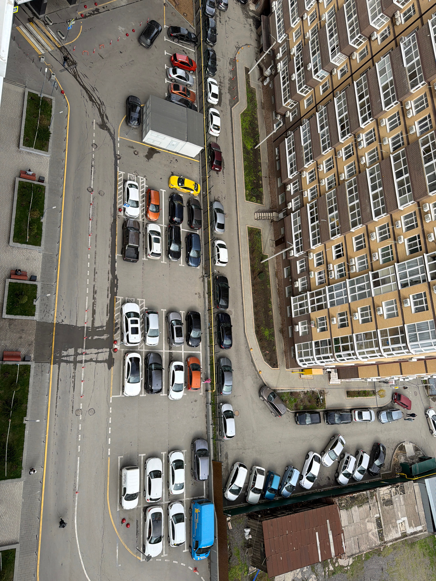The image presents an aerial view of a residential area, specifically a parking lot next to a multi-story apartment building. **Location:** The image likely originates in Azov, Russia, although thisβ¦read more