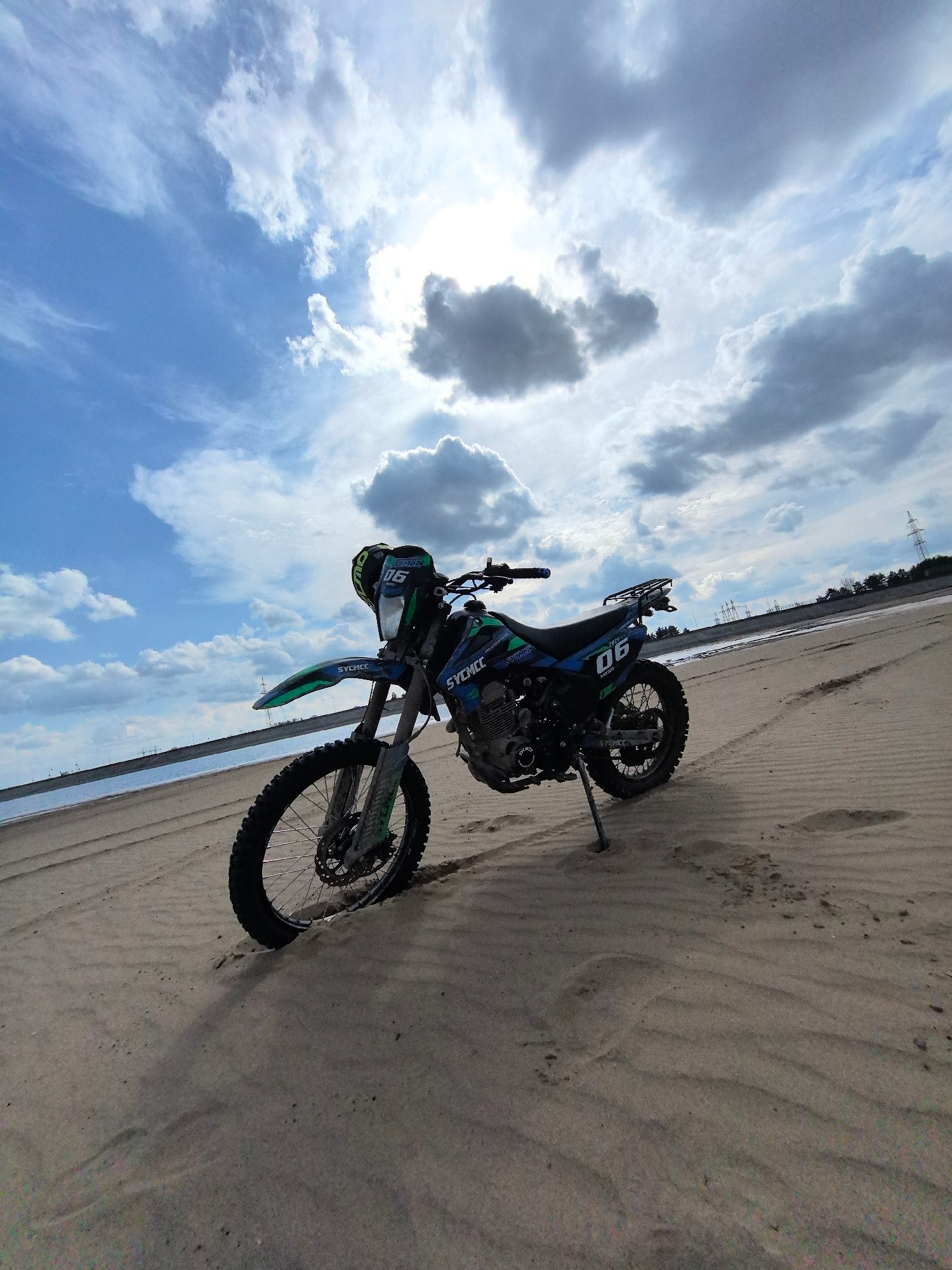 A blue and green dirt bike, identified by the brand "SYCHEE" and the prominent number "06" on its side panels and front, is parked on a sandy beach or shoreline. A black helmet rests on the bike's han…read more
