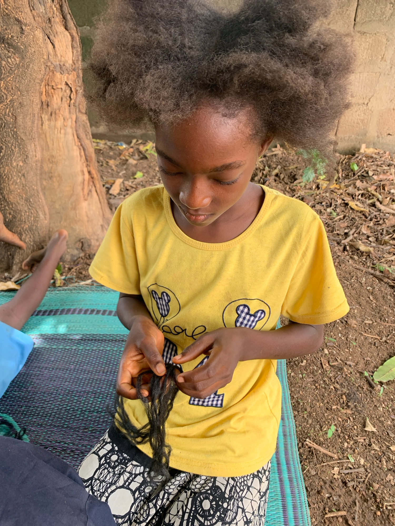 Akwanga, Nigeria. A brown-skinned person with dark, voluminous hair is seated on a patterned mat outdoors, wearing a yellow t-shirt with cartoon bear images. The person is holding and manipulating sev…read more